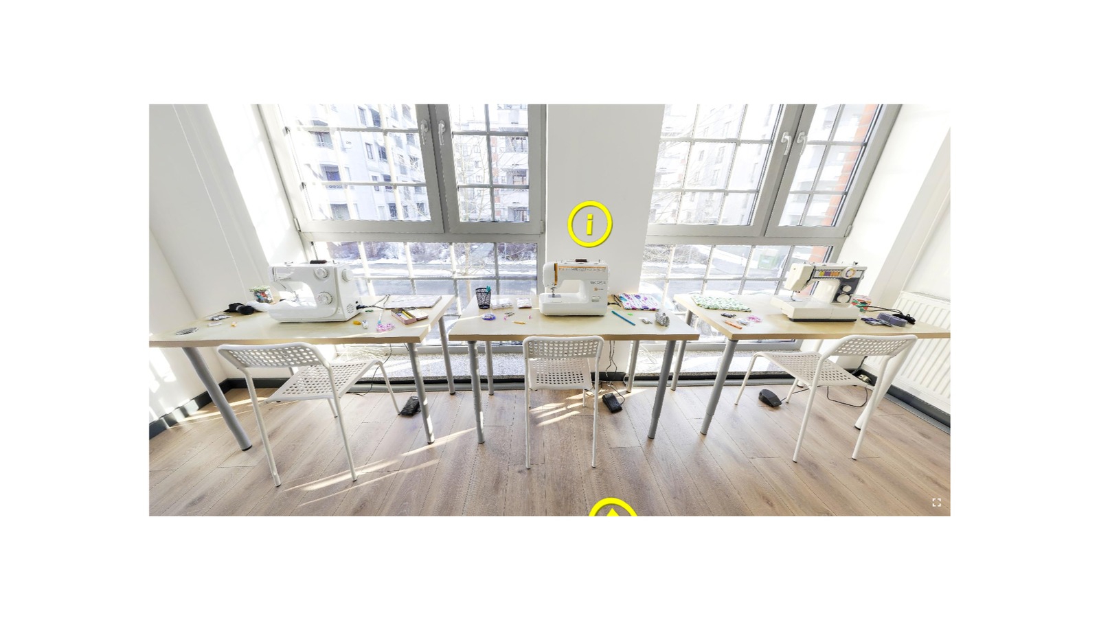 Wirtualna wycieczka przedstawia wnętrze pracowni kroju i szycia. Pracownia jest przestronna. Widoczne są duże okna, pod którymi ustawione są stanowiska pracy. Jedne z nich to niewielkie biurka z krzesłami. Na biurkach stoją maszyny do szycia i inne potrzebne przybory. Pod jedną ze ścian znajduje się duży stół, na którym leży rozwinięty materiał. Wokół na blacie leżą miarki, nożyczki i inne przybory. W przestrzeni umieszczone są punkty interaktywne. Po ich kliknięciu pojawiają się plansze z tekstem.