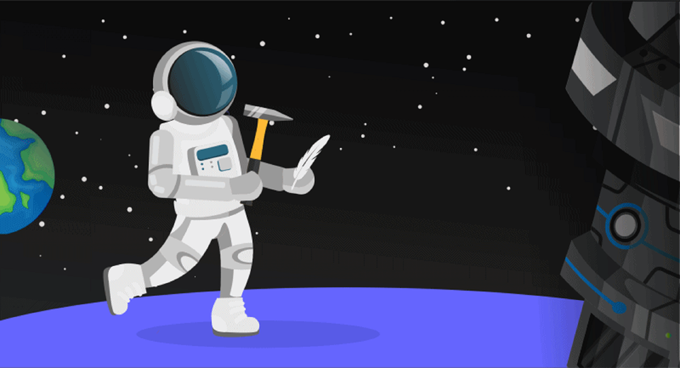 Animacja. Astronauta w skafandrze upuszcza równocześnie młotek i piórko. Przedmioty upadają na powierzchnię Księżyca w tym samym momencie. W tle czarne niebo usiane gwiazdami i kawałek Ziemi. Na pierwszym planie widać fragment statku kosmicznego.