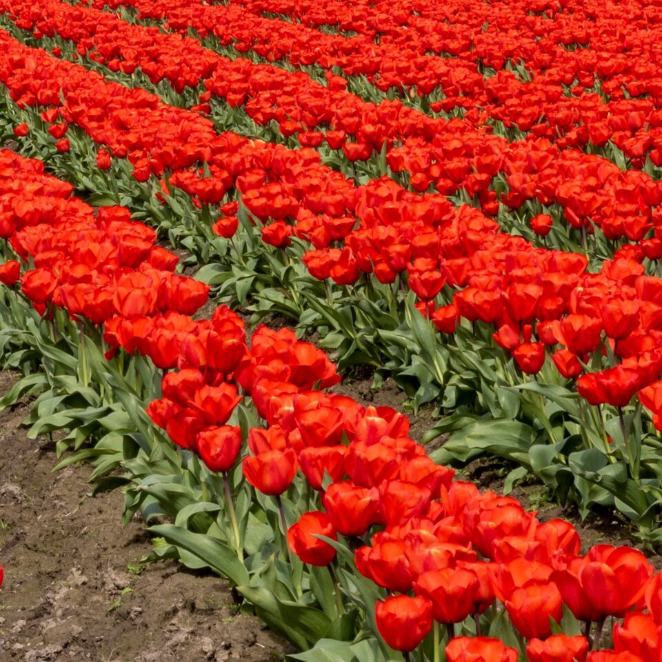 Zdjęcie przedstawia pole czerwonych tulipanów.