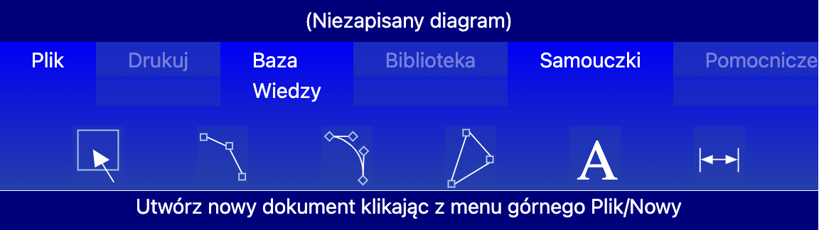 Elementy rysunku technicznego możemy narysować. W tym celu należy wykorzystać dostępne narzędzia. Nazwy narzędzi pojawiają się po najechaniu na ikonę narzędzia. Aby wybrać narzędzie należy kliknąć ikonę. Na granatowym pasku poniżej ikony wyświetlona zostanie instrukcja korzystania z narzędzia.