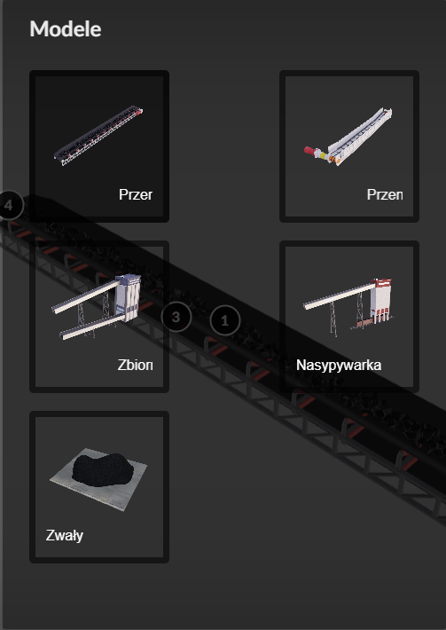 Na ekranie widać interaktywny model trójwymiarowy nasypywarki. Na modelu zaznaczono kolejnymi cyframi poszczególne elementy przenośnika taśmowego. Po naciśnięciu danej cyfry rozwija się szczegółowy opis danego elementu wraz z nagraniem audio. Nagranie audio odpowiada tekstowi znajdującemu się w opisie elementu.