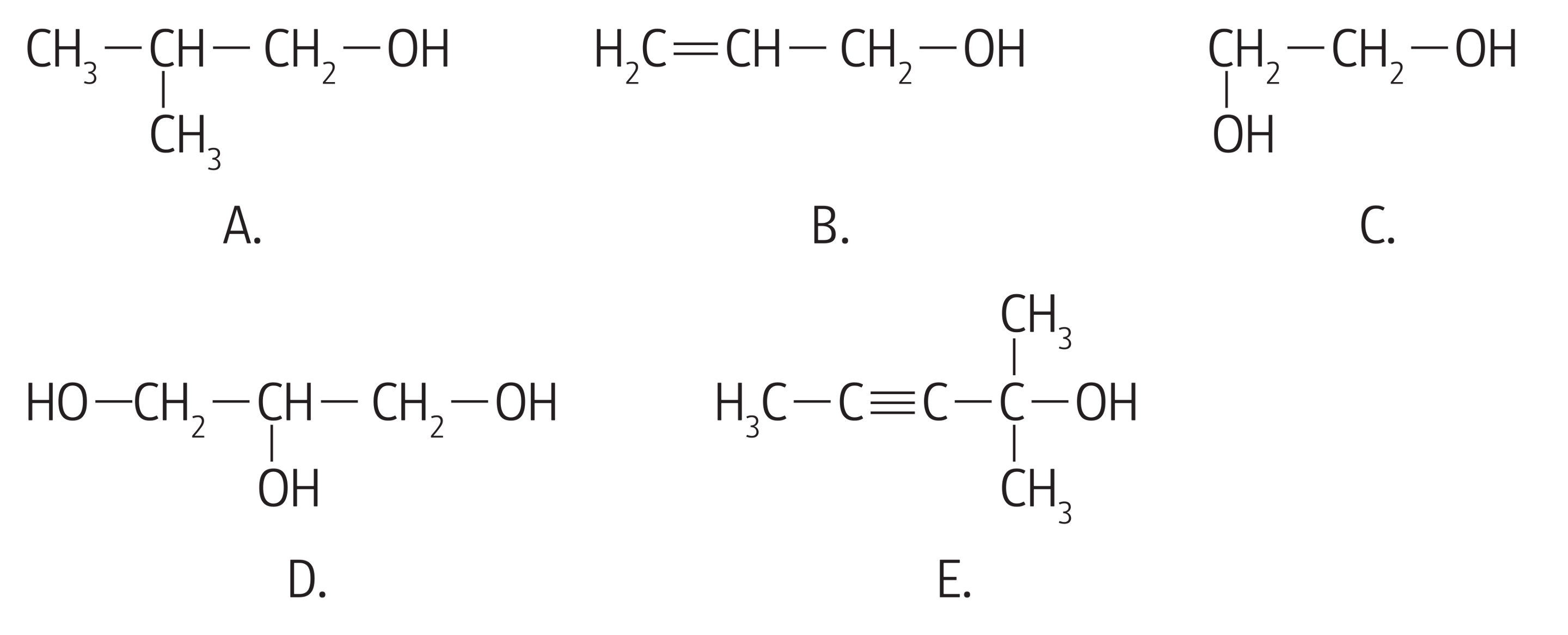 propan-1,2,3-triol, etan-1,2-diol, 2-metylopropan-1-ol, prop-2-en-1-ol, 2-metylopent-3-yn-2-ol