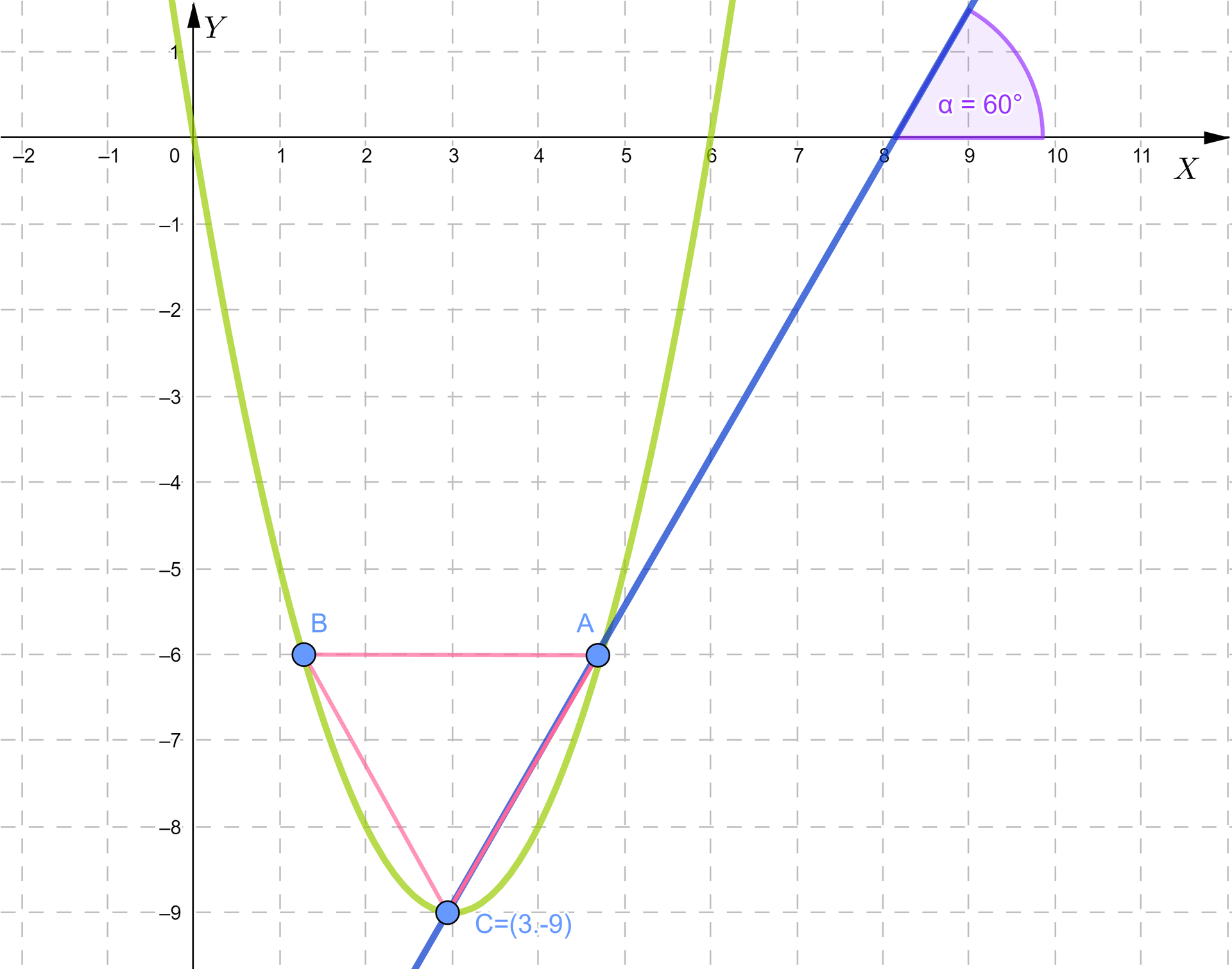 Dana jest parabola o równaniu . Wpisano w nią trójkąt równoboczny w taki sposób, że punkt znajduje się w wierzchołku paraboli, zaś punkty i leżą na prostej równoległej do osi oraz na paraboli . Wyznacz współrzędne punktów i . Wiemy, że współrzędne punktu to , minus , a prosta przechodząca przez punkty i , gdzie leży na prawym ramieniu paraboli, jest nachylona do osi pod kątem sześćdziesięciu stopni. Parabola przecina oś w punktach zero oraz sześć. Wiemy też, że punkty i leżą na wysokości minus .