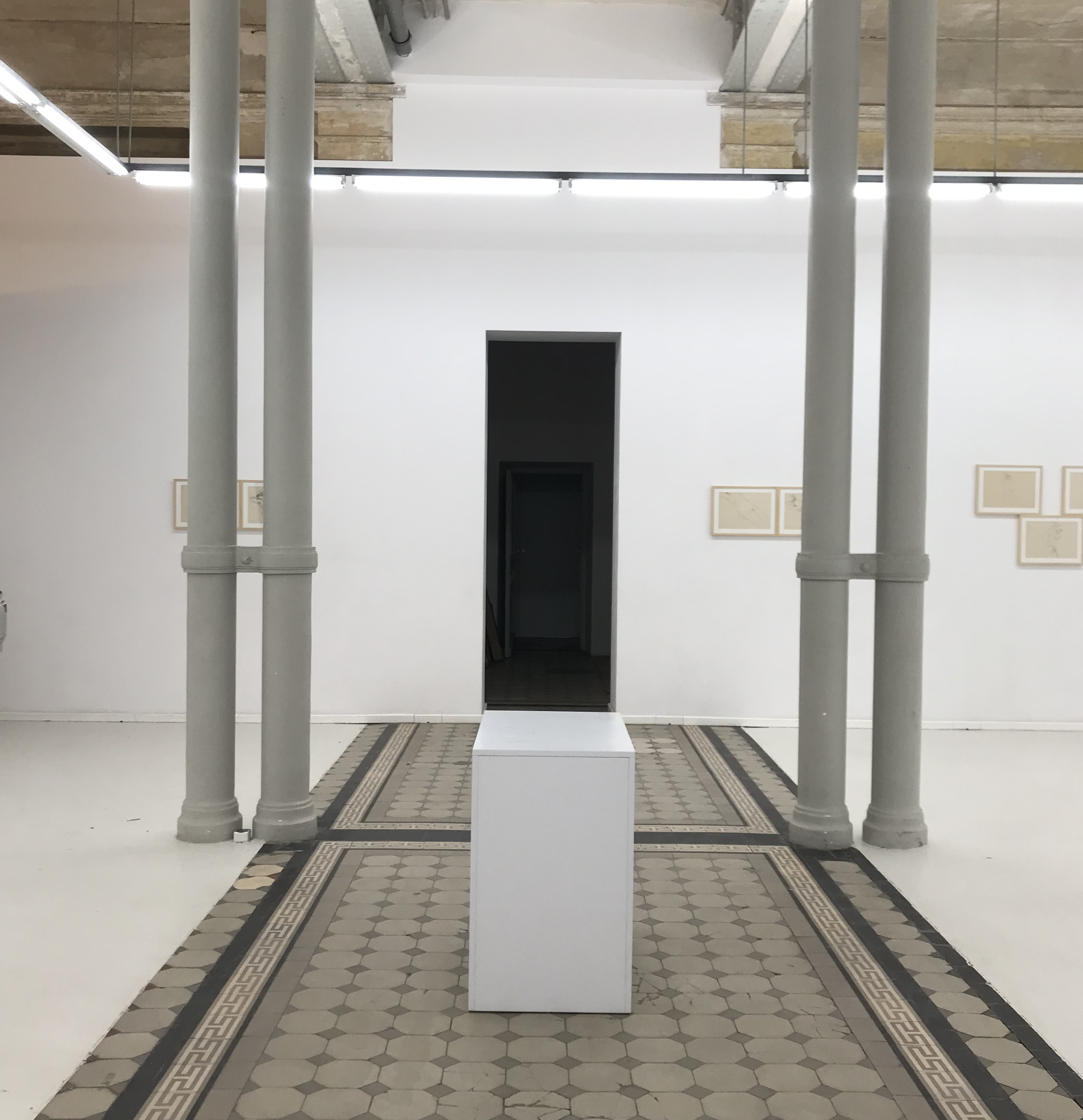 W pomieszczeniu, w połowie drogi między ścianą a czterema szarymi kolumnami, umieszczono białe pudło. Które z poniższych zdjęć najlepiej oddaje wrażenia wzrokowe krótkowidza?