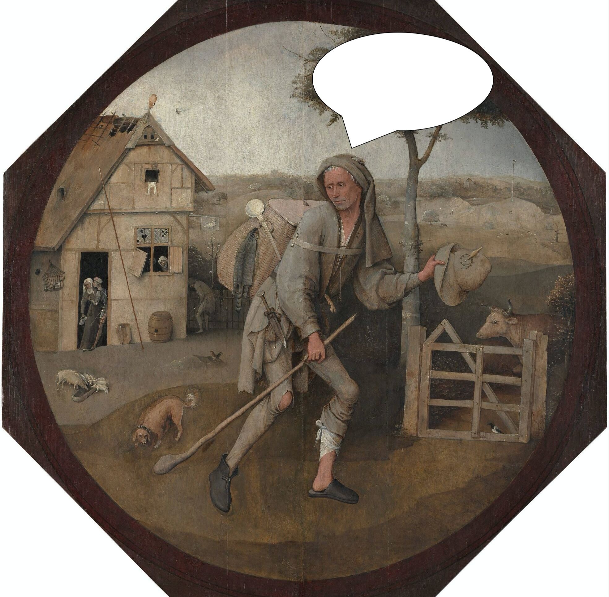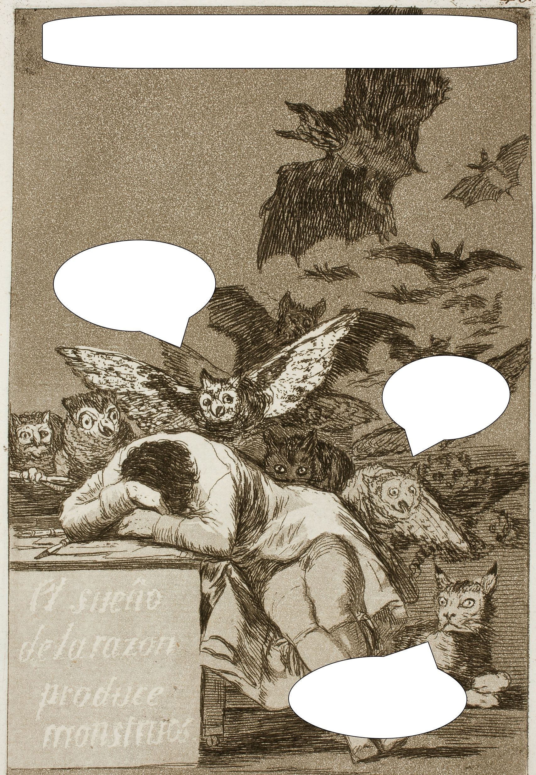 Zapoznaj się z opisami reprodukcjami znanych dzieł malarskich: Wędrowca Hieronima Boscha i i ryciny Francisca Goi Gdy rozum śpi, budzą się demony. Następnie na ich podstawie zaproponuj dwa memy, poprzez uzupełnienia tekstów wypowiadanych przez postaci namalowane na obrazach. Oba memy mają odnosić się do poglądów Hume'a na temat relacji uczuć i rozumu w doświadczeniu ludzkim. Możesz zarówno próbować przytoczyć te poglądy, jak też skomentować poprzez mem.