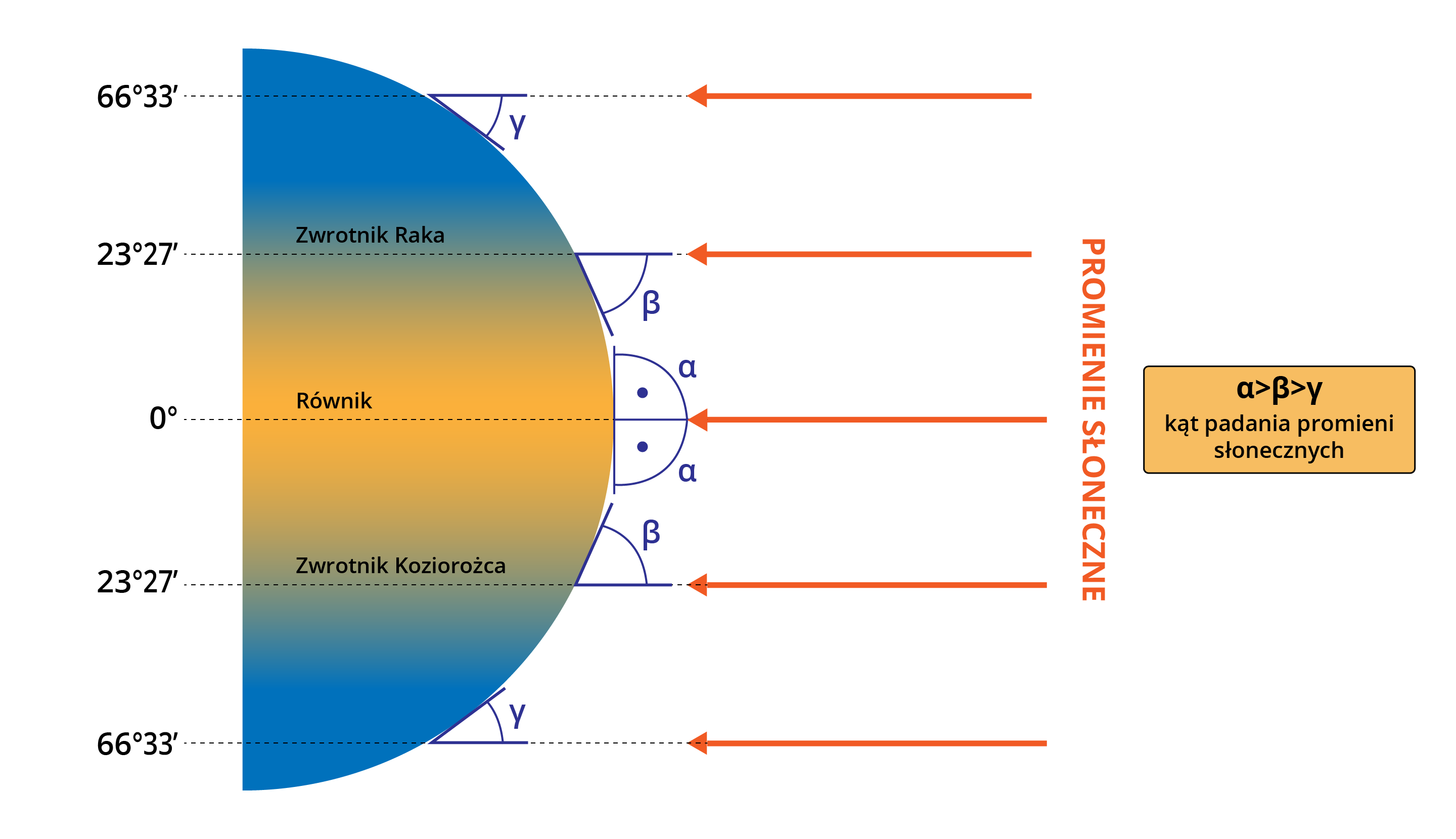 - Zależność kąta padania promieni słonecznych od szerokości geograficznej.