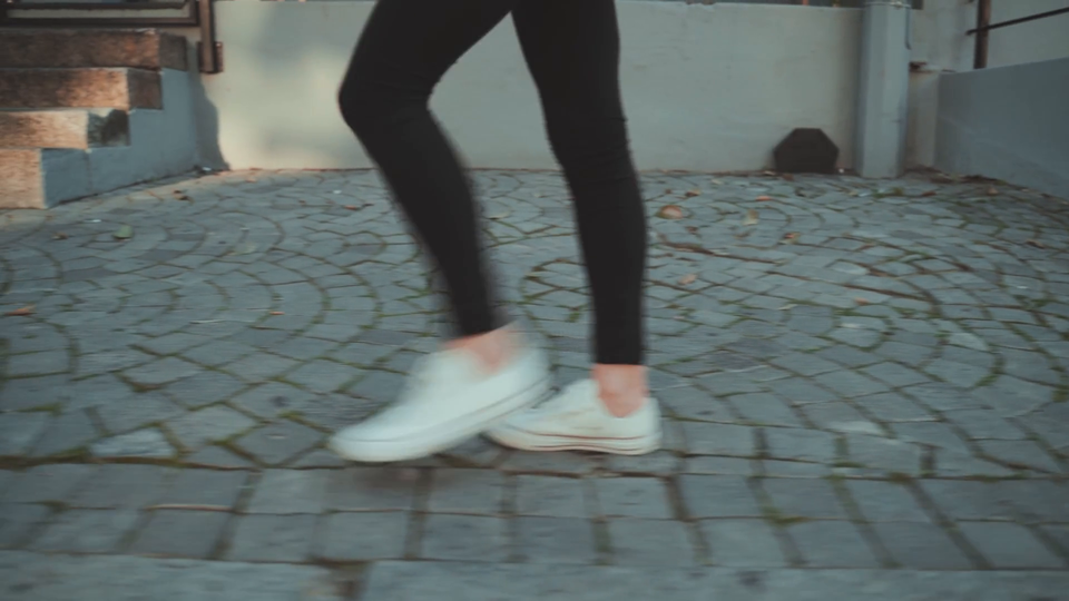 Film przedstawia zbliżenie na nogi, osoby, która chodzi.