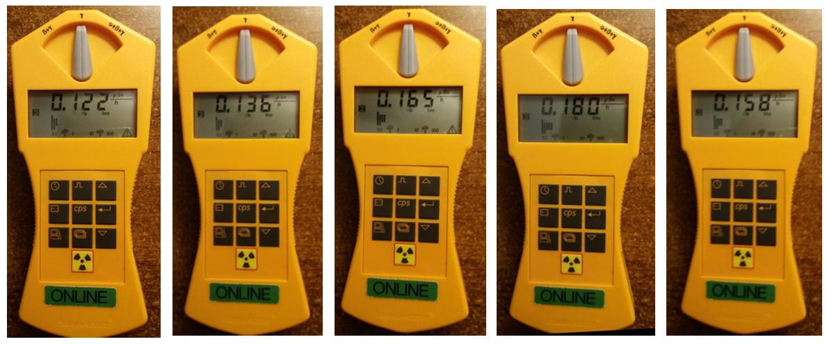 Dla ilustracji, na rysunku poniżej pokazanych jest kilka przykładów odczytu ze skali dozymetru. Pomiary te zostały wykonane w tym samym miejscu i (prawie) w tym samym czasie. (Nie martw się, że na razie nie wiesz, co to jest moc dawki. Prawidłowości w wartościach tych liczb i bez tej informacji możesz zaobserwować. A swoją drogą, „moc dawki promieniowania” warta jest kliknięcia w przeglądarkę.)