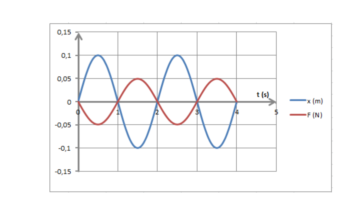 Wykres przedstawia zależność siły i wychylenia od czasu ciała poruszającego się ruchem harmonicznym.