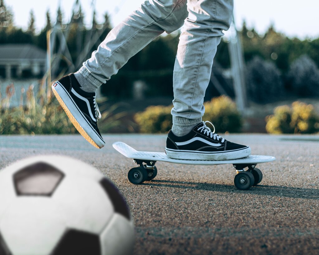 - W zależności od siły pchnięcia piłka pozostanie w spoczynku lub zacznie się poruszać wzdłuż deskorolki, w kierunku zgodnym z kierunkiem jej ruchu.