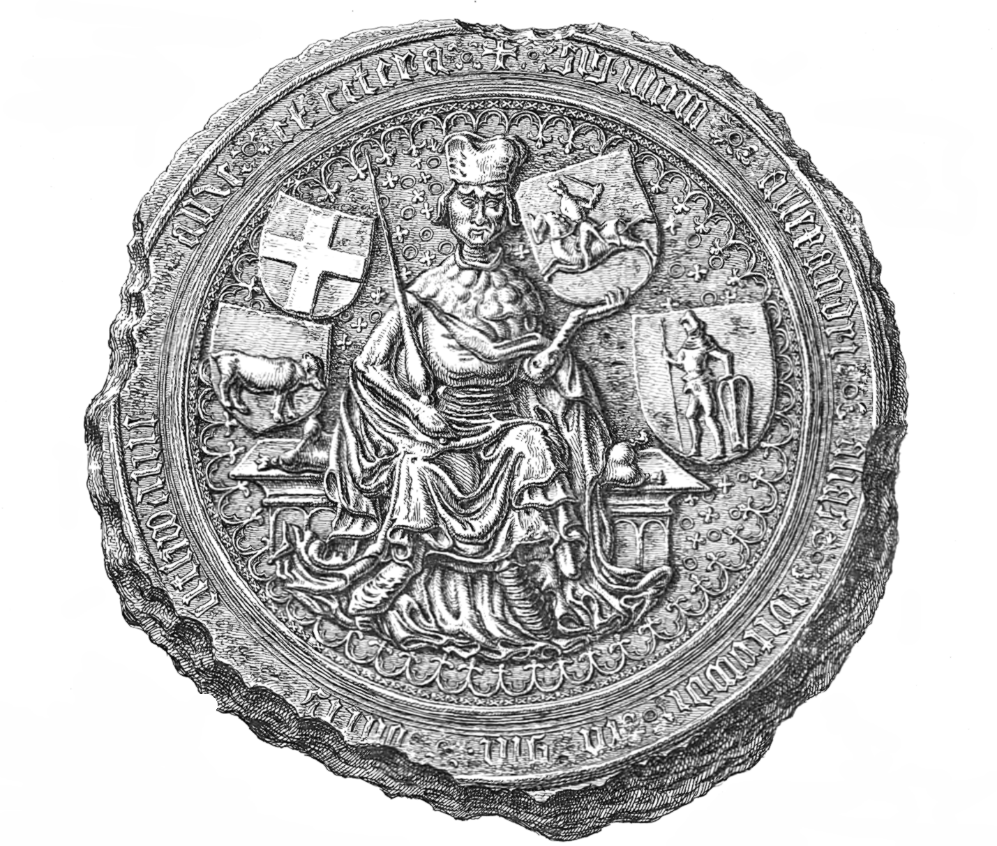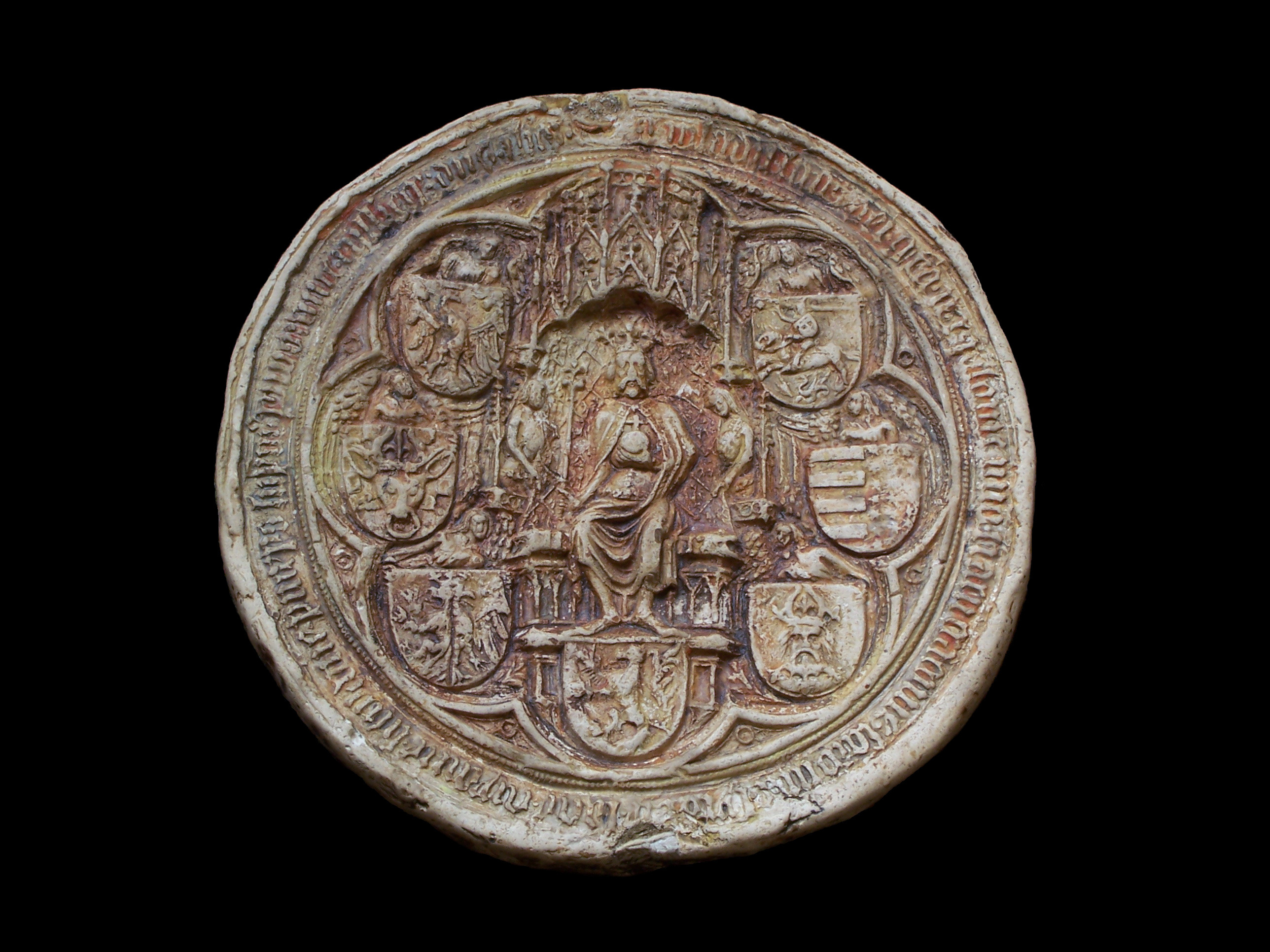 W średniowieczu każdy dokument wydany przez kancelarię królewską musiał być uwierzytelniony za pomocą pieczęci. Pieczęć nadawała moc prawną dokumentowi, ale też zabezpieczała go przed naruszeniem. Stanowiła ona znak rozpoznawczy każdego władcy. Spośród podanych niżej trzech pieczęci wybierz tę, która była używana przez Władysława Jagiełłę, a następnie uzasadnij swój wybór.