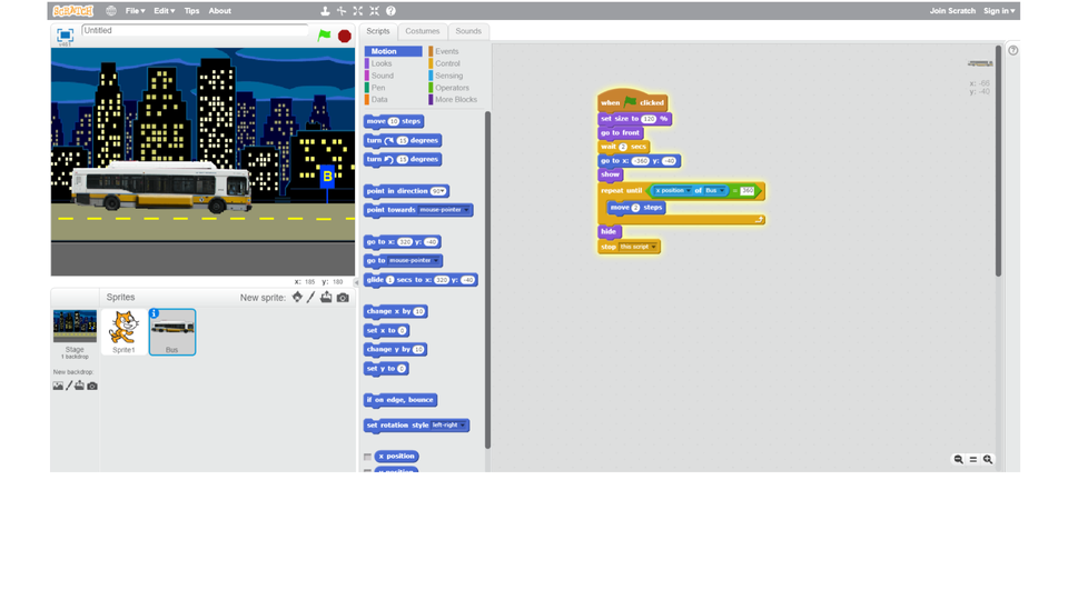 The bus can move if it does not touch the cat‑sprite. You can use the block repeat until ... and the sensorsensorsensor touching ... .