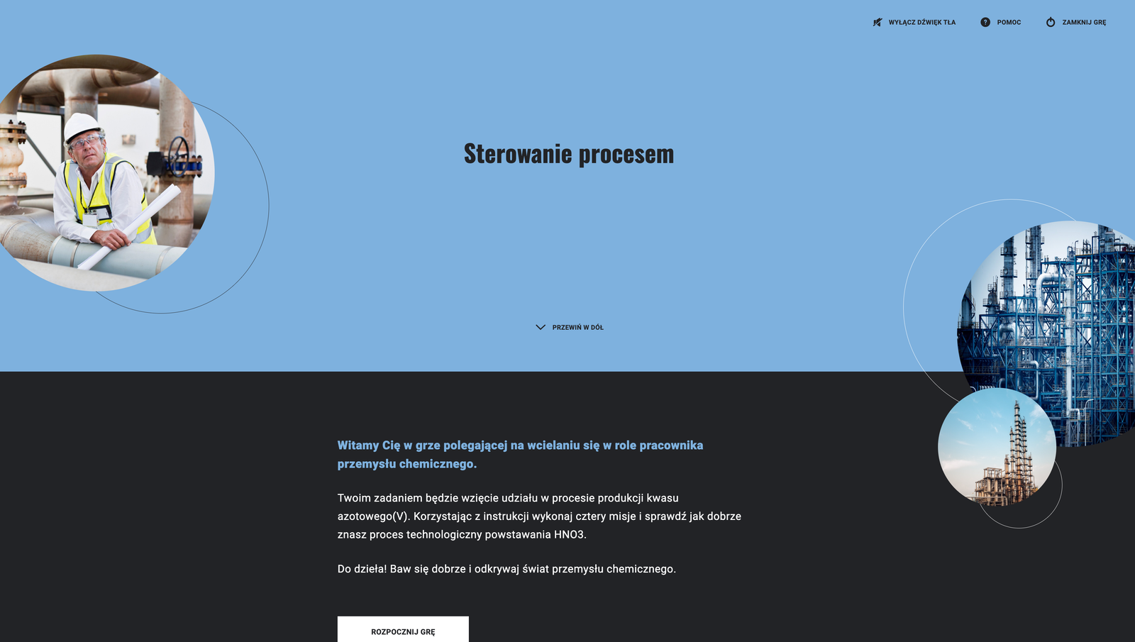 Gra umożliwia wcielenie się w rolę pracownika przemysłu chemicznego i przeprowadzenie procesu otrzymywania kwasu azotowego(V). Celem gry jest nauka oraz utrwalanie wiedzy z zakresu monitoringu procesowego, doboru maszyn i urządzeń oraz wymogów dotyczących prowadzenia kontroli ruchowej i międzyoperacyjnej. W trakcie gry będziesz miał możliwość rozwiązywania zadań opierających się na wizualnej analizie rysunków technicznych aparatów wykorzystywanych w procesie. Zapoznania się z założeniami procesów oraz ich parametrami.
