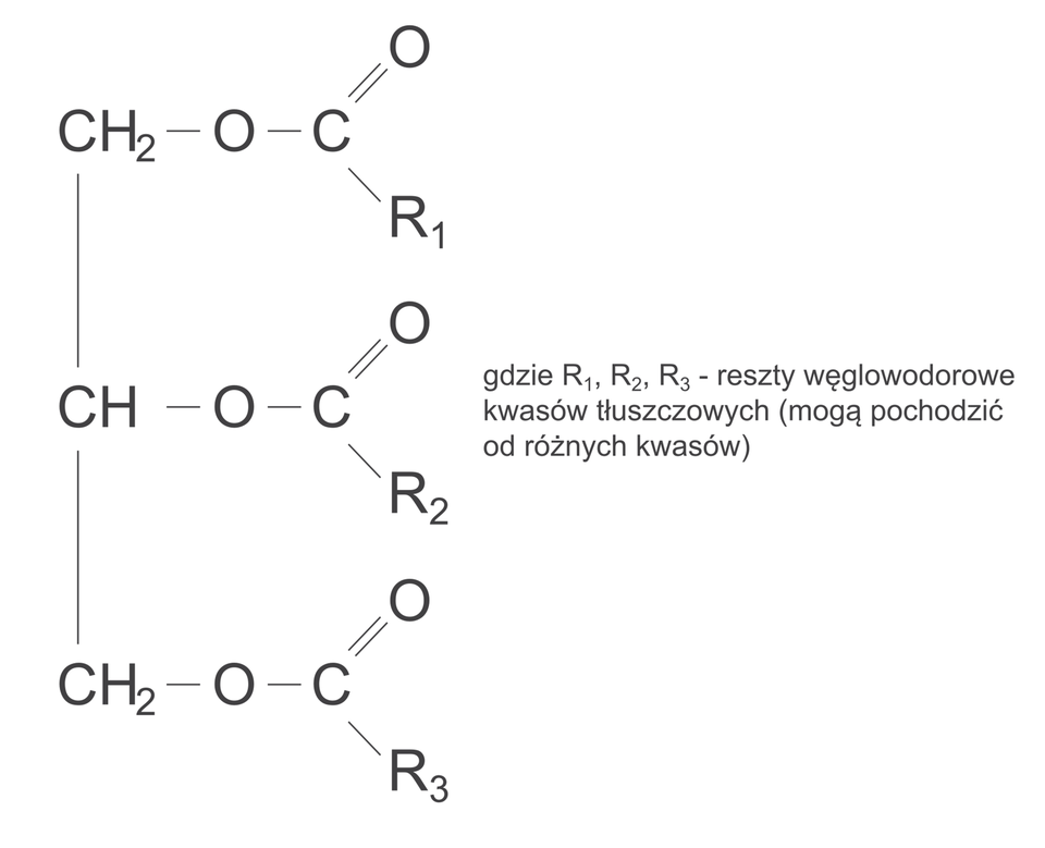 Wzór strukturalny tłuszczu. Cząsteczki tłuszczów mogą zawierać rodniki kwasowe różnych kwasów tłuszczowych - Fat molecules may contain acid radicals of various fatty acids. R1, R2, R3 w strukturze tłuszczu oznacza reszty węglowodorowe kwasów tłuszczowych (mogą pochodzić od różnych kwasów) -hydrocarbon radicals of fatty acids (may come from various acids)