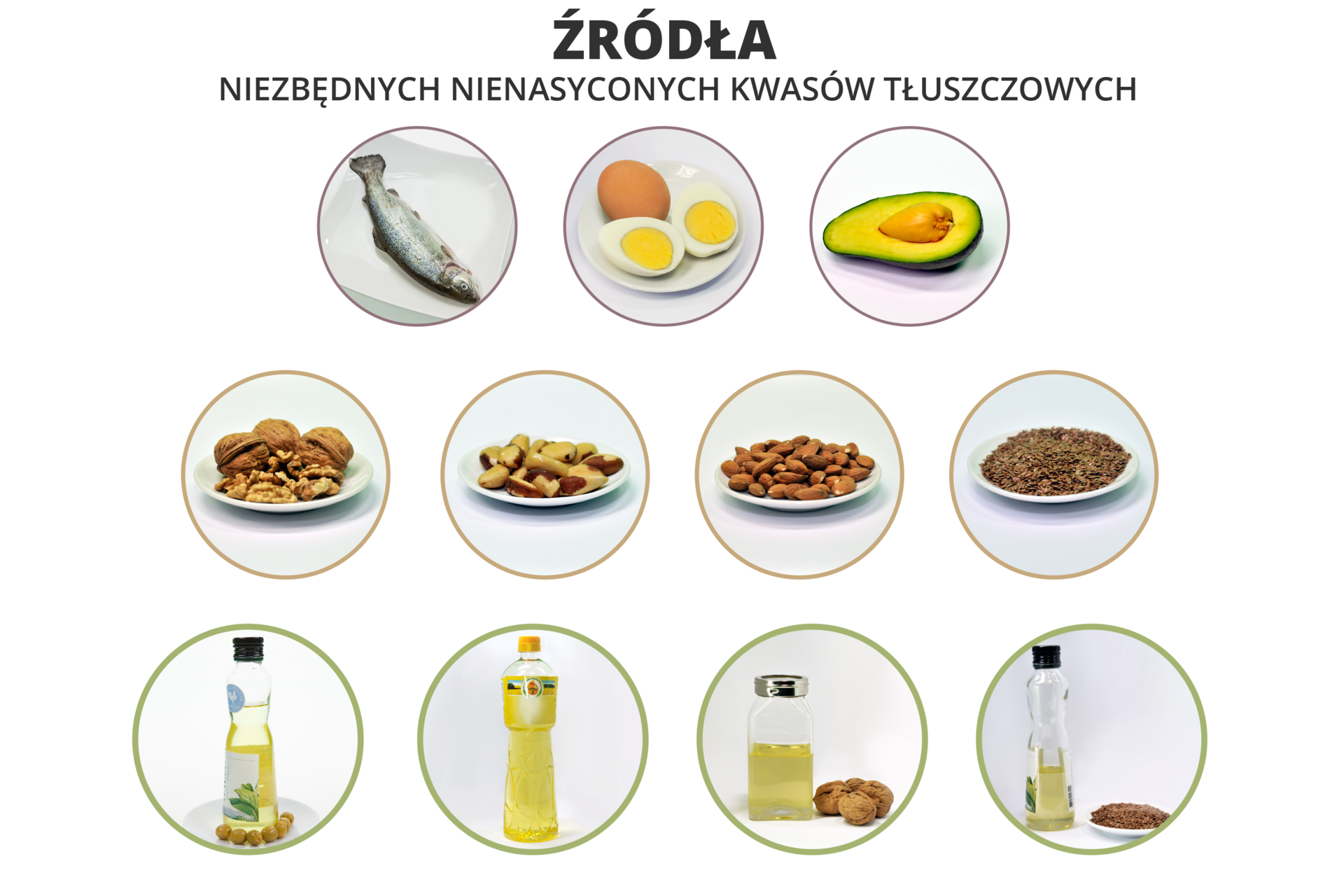 Ilustracja interaktywna. Źródła niezbędnych nienasyconych kwasów tłuszczowych - sources of essential fatty acids. 1. tłuste i chude ryb - Oily and lean fish , 2. jajka - Eggs, 3. awokado - Avocado, 4. orzechy włoskie - Walnuts, 5. orzechy brazylijskie - Brazil nuts, 6. migdały - Almonds, 7. mielone siemię lniane - Ground flaxseed , 8. oliwa z oliwek - Olive oil , 9. olej rzepakowy - Rapeseed oil , 10. olej z orzechów - Nut oils , 11. olej lniany - Linseed oil. sources of essential fatty acids