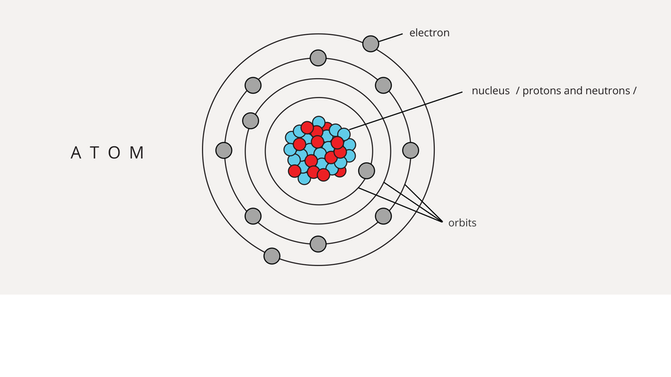 - The structure of an atom - an atom consists of a nucleus in which there is a positively charged proton and a neutron that has no charge. Outside of the nucleus, electrons with a positive charge circulate around closed curves called orbits or shells.