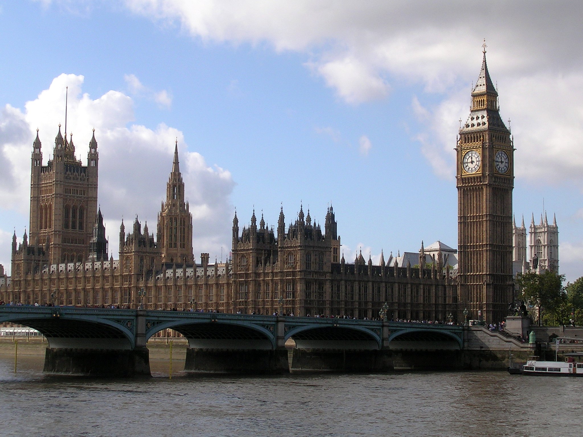 W 1834 roku pożar zniszczył budynki parlamentu londyńskiego. Ze starej budowli zachował się jedynie Westminster Hall, krużgankikrużganki kaplicykaplicy św. Szczepana i Wieża Klejnotów. W konkursie na rekonstrukcję pałacu wziął udział architekt, Charles Barry, który zaproponował odbudowę w stylu neogotyckim, wzorowaną na kaplicy Henryka VII z Opactwa Westminster. Obiekt wyposażony został w prostokątne okna, ośmioboczne wieżyczki w elewacjachelewacjach, a całość ozdobiono kamiennymi ornamentami. Budowla w założeniu jest dwuosiowa i symetryczna, jedynie na zewnątrz traci symetrię ze względu na rozmieszczenie wież.
