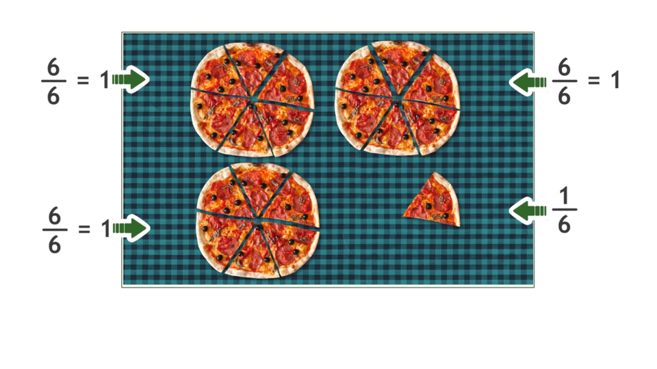 Rysunek pizzy podzielonej na 12 równych kawałków, zaznaczono w pętli 7 kawałków i 5 kawałków. Obok pętli zawierającej 5 kawałków zapis ułamek pięć dwunastych.