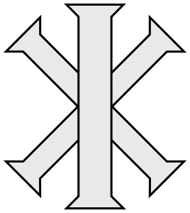 3. Monogram jota-chi Skrzyżowanie liter I – X (jota chi), oznaczających słowa Iesous Christos. Nazwa monogramu pochodzi od nazw tworzących je liter: jota oraz chi. Oprócz rozwinięcia monogramu, każącego widzieć w nim skrót od słów Jezus Chrystus, istniały jeszcze wyjaśnienia, zgodnie z którymi litery te miały oznaczać In Christo (w Chrystusie).