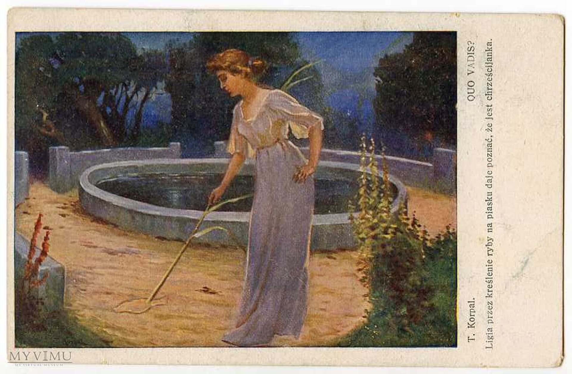 Ilustracja autorstwa Tadeusza Korpala pod tytułem: „Ligia rysuje rybę”. Na ilustracji widoczna jest młoda ciemnowłosa kobieta, ubrana w długą niebieska suknię. Jedną dłoń ma opartą o biodra, a w drugiej trzyma patyk, którym rysuje na piasku rybę. W tle widoczna jest fontanna oraz drzewa. Dodatkowo na ilustracji umieszczono następujące informacje: 1. Ryba to najstarszy symbol chrześcijaństwa, stosowany przede wszystkim w okresie prześladowania pierwszych chrześcijan, gdy musieli się oni ukrywać. Ryba po grecku to ΙΧΘΥΣ. Kolejne litery wyrazu skojarzone zostały z dodatkowym znaczeniem: ΙΗΣΟΥΣ, Ἰησοῦς (Iēsoûs) – Jezus ΧΡΙΣΤΟΣ, Χριστὸς (Christós) – Chrystus ΘΕΟΥ, Θεοῦ (Theoû) – Boga ΥΙΟΣ, Υἱὸς (Hyiós) – Syn ΣΩΤΗΡ, Σωτήρ (Sōtér) – Zbawiciel I tak ryba stała się symbolem Chrystusa i chrześcijan. Akrostych powiązany był ze Starym Testamentem i Księgą Jonasza – trzydniowe przebywanie proroka w brzuchu ryby stawało się w tej symbolice prefiguracją męki i zmartwychwstania (Mt, 12, 39). Symbolika ryby związana jest również z sakramentem chrztu. Tertulian[1] odwoływał się do symboliki ryby, pisząc, że człowiek, na podobieństwo ryby, którą jest Jezus Chrystus, rodzi się w wodzie i poprzez pozostawanie w niej zostanie zbawiony. Do dziś symbol ryby jest używany jako znak rozpoznawczy chrześcijan. Najsłynniejszą sceną ujawnienia się chrześcijanki jest niewątpliwie narysowanie ryby przez Ligię, bohaterkę książki Quo vadis. Właśnie dzięki temu symbolowi Marek Winicjusz orientuje się po czasie, że jego ukochana jest wyznawczynią Chrystusa. [1] Tertulian – Tertullianus (Quintus Septimus Florens Tertullianus) – żyjący na przełomie II i III wieku łaciński teolog, nawrócony na chrześcijaństwo, apologeta i dogmatyk. S. Kalinkowski, Scire Latine. Język łaciński. Podręcznik dla alumnów i studentów teologii.