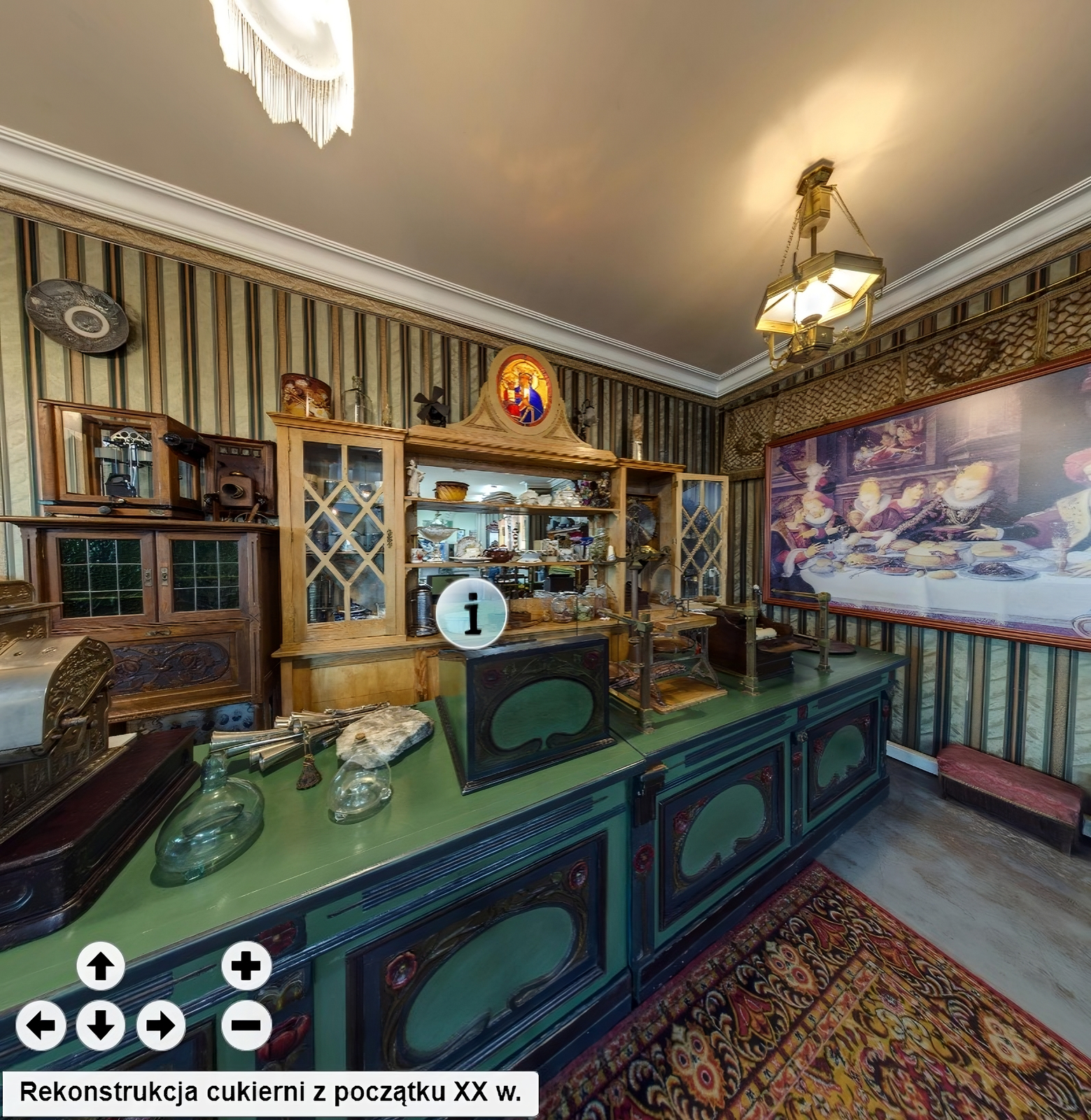 Spacer zaczynamy od sali, która jest rekonstrukcją cukierni z początku XX w. Znajduje się tam wiele starych mebli: regały, kredensy, dwa niewielkie stoły, jeden stolik, krzesła tapicerowane, kanapa, ławka tapicerowana, kufer, niewielka pufa, krzesło dla małego dziecka, lustra, obrazy. Z lewej strony pomieszczenia, pod oknem, znajdują się stoły, krzesła i kanapa przewidziana dla gości. Obok, z prawej strony pomieszczenia, lada, a za nią kredens. Na regałach i kredensach wiele naczyń porcelanowych i szklanych oraz niewielkich ozdób. Na ladzie znajdują się stare kasy oraz przedmioty służące do obsługi klientów. Na jednym z kredensów, stojącym za ladą, widoczny przycisk z literą „i”, który umożliwia dokładne obejrzenie formy do pieczenia babki wielkanocnej w białym kolorze (kształtem podobna do współczesnych form). Drugi przycisk z literą „i” umożliwia obejrzenie krzesła ze wzornictwem inspirowanym kłosami: na oparciu wyrzeźbione kłosy zboża.