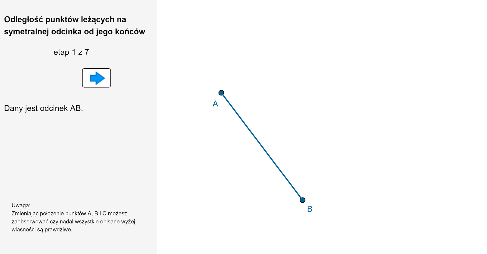 Jeżeli punkt leży na symetralnej odcinka, to jest równoodległy od końców tego odcinka.