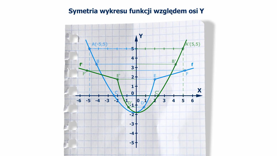 Animacja pokazuje przekształcenie wykresu funkcji w symetrii względem osi OY. Zaznaczamy na wykresie funkcji kilka punktów i przekształcamy je w symetrii względem osi OY. Przekształcone punkty po połączeniu tworzą wykres funkcji symetrycznej do danej funkcji względem osi OY.