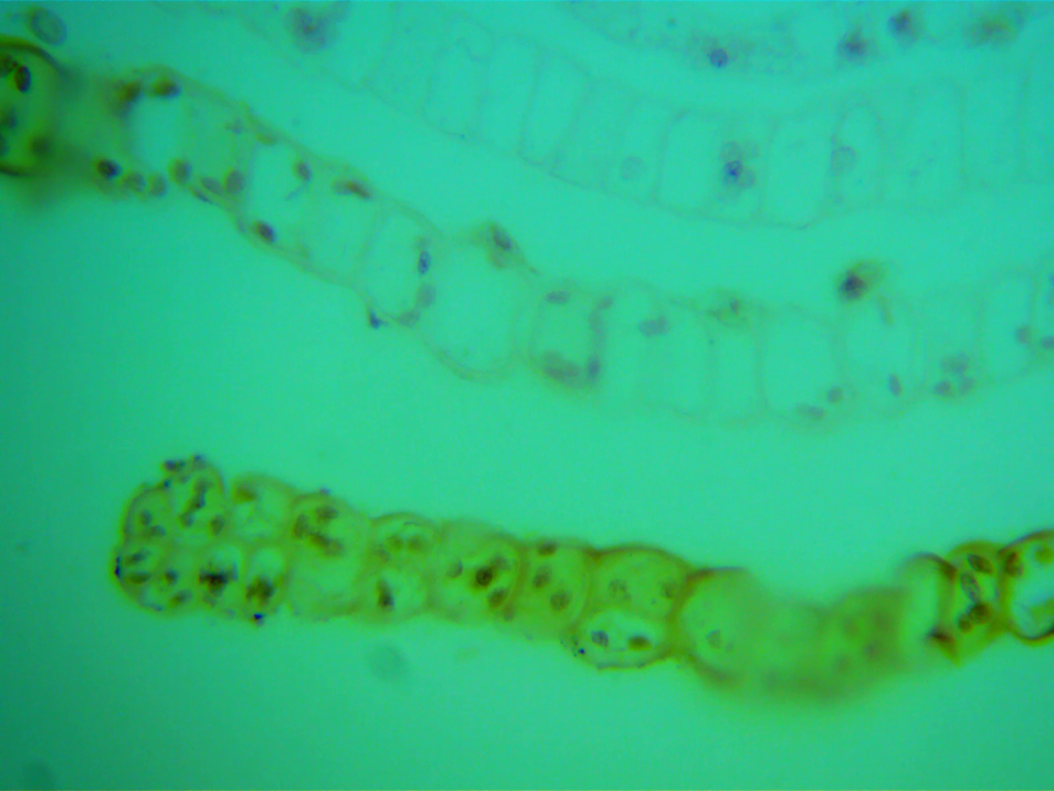 Wirtualny mikroskop. Obrazy mikroskopowe rodni mchu płonnika Polytrichum commune. Żeńskie gametangia mszaków nazywane są rodniami lub archegoniami. Są to wielokomórkowe struktury mające kształt wazonika z długą szyjką, na którego dnia znajduje się tylko jedna, duża i nieruchliwa komórka jajowa. Szyjka składa się z kilku komórek kanałowych. Całość otoczona jest pojedynczą warstwą komórek tworzących ściankę rodni. Wszystkie rodnie powstające na szczycie ulistnione łodyżki – gametoficie żeńskim, otoczone są liśćmi okrywającymi. W powieszeniu czterokrotnym na ilustracji pomiędzy zielonymi nitkami są fioletowe owale. W powiększeniu dziesięciokrotnym można zauważyć, że fioletowe owale zbudowane są z drobnych kropek. W powiększeniu czterdziestokrotnym drobne filetowe kropki - komórki tworzące skupiska otoczone są cienką warstwą komórek.