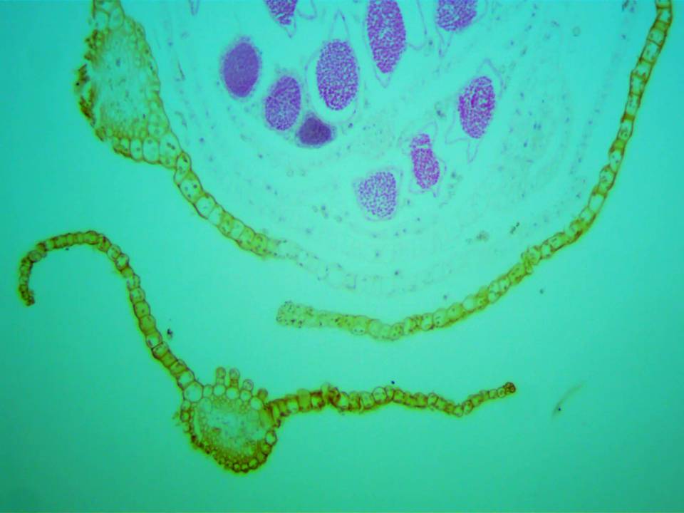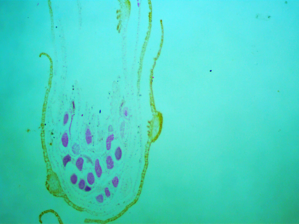 Za pomocą wirtualnego mikroskopu przeprowadź obserwację koszyczka rodni mchu płonnika (Polytrichum commune). Zwróć uwagę na kształt rodni oraz lokalizację komórek jajowych.