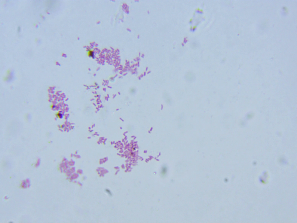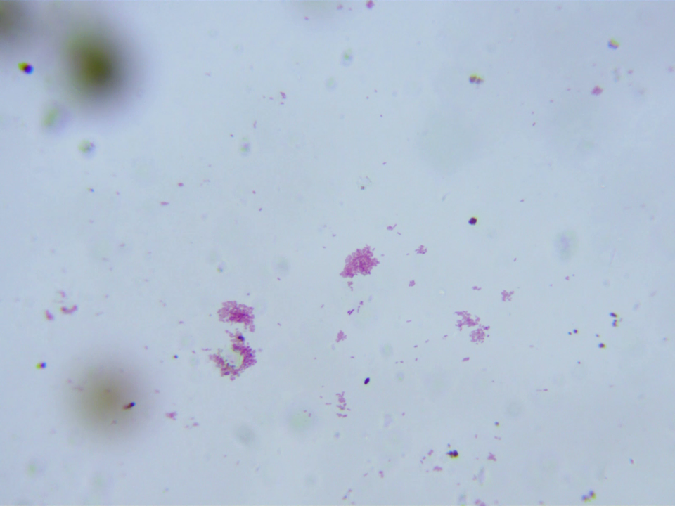 Film przedstawia obserwację próbki pod mikroskopem w przybliżeniu tysiąc razy. Próbka przesuwana jest pod mikroskopem w różne strony. Ukazane są skupiska bakterii wybarwionych na różowo. Mają one pałeczkowaty kształt. Są też ukazane nieregularne, pojedyncze plamy o ciemnym wybarwieniu.