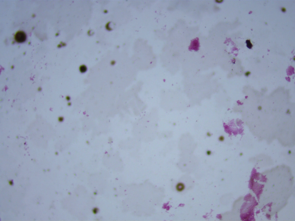 Przybliżenie 10×10. Widoczny jest niewyraźny obraz spod mikroskopu. Jest na nim kilka skupisk bakterii, wybarwionych na różowo. Nie można określić kształtu tych bakterii.