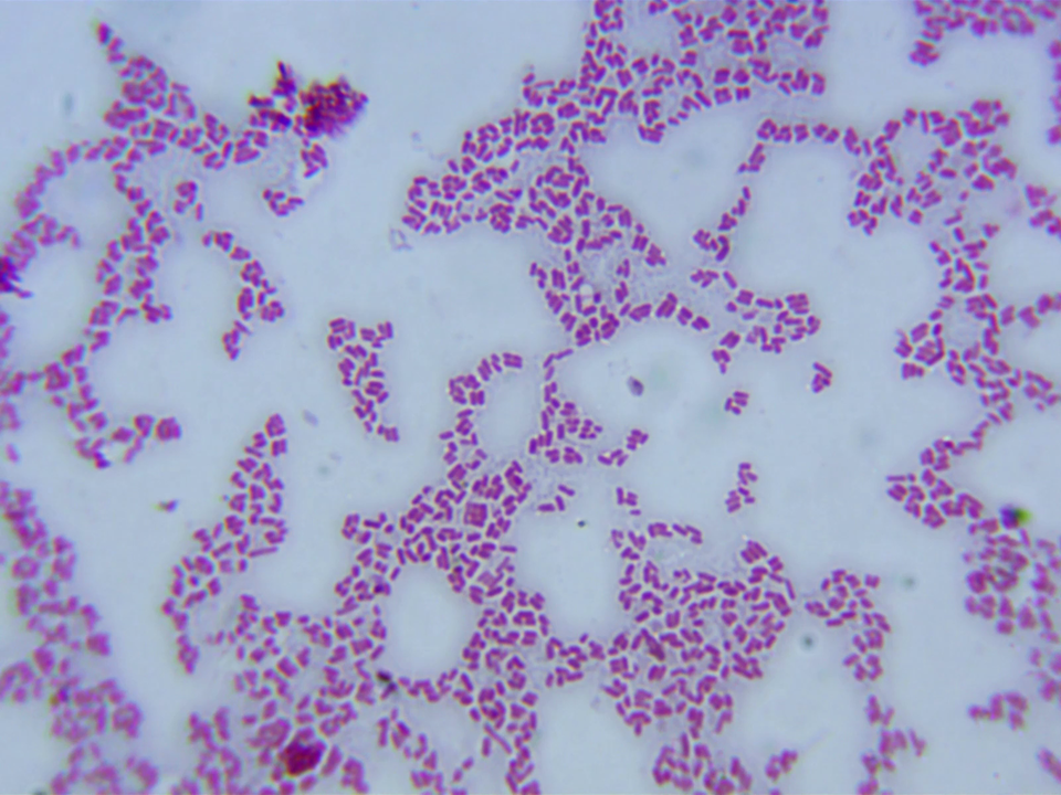 Przybliżenie 40×40. Widoczny jest obraz spod mikroskopu. Są na nim liczne skupiska bakterii o pałeczkowatym kształcie, wybarwione na ciemnoróżowo.