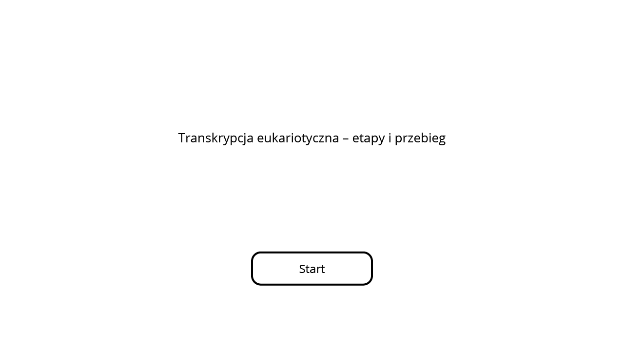 Symulacja przedstawia transkrypcję eukariotyczną – jej etapy i przebieg. Na białej planszy znajduje się prostokątne pole z napisem: START. Po kliknięciu tego pola pojawia się łańcuch DNA w formie podwójnej helisy z leżącymi wewnątrz komplementarnymi zasadami azotowymi w postaci łączących się ze sobą kolorowych odcinków. Na początku łańcucha widnieje nad nim cyfra 5 indeks górny znak prim, a pod nim cyfra 3 indeks górny prim. Na końcu łańcucha widnieje nad nim cyfra 3 indeks górny prim, a pod nim cyfra 5 indeks górny prim. Na początku łańcucha zaznaczone jest jasnoczerwone prostokątne pole, w znajduje się narysowany przerywaną linią kontur sześciokąta, łączący się z narysowanym przerywaną linią konturem pięciokąta. Na skraju jasnoczerwonego pola i białej przestrzeni wzdłuż łańcucha DNA znajduje się narysowany przerywaną linią kontur koła. Na końcu łańcucha DNA umieszczone są trzy kontury prostokątów z zaokrąglonymi rogami w kolorze jasnoszarym. Nad łańcuchem umieszczone są figury geometryczne: fioletowe koło z podpisem: polimeraza RNA, zielony sześciokąt i różowy pięciokąt z podpisem: czynniki transkrypcyjne oraz prostokąt narysowany przerywaną linią z zaokrąglonymi rogami w kolorze czarnym z podpisem: terminator. Obok znajduje się prostokątna ramka z podpisem: twoja kolekcja mRNA, a za nią napis INSTRUKCJA ze strzałką w dół, za pomocą której rozwija się pole. Po kliknięciu na nią pojawia się opis: 1. Stwórz trzy różne mRNA, 2. Umieść terminator w wybranym przez siebie miejscu, aby wyznaczyć długość sekwencji transkrybowanej, 3. Przenieś czynniki transkrypcyjne w odpowiednie miejsca, 4. Przesuń polimerazę RNA na wyznaczoną pozycję, aby rozpocząć transkrypcję. 5. Proces powtórz trzy razy.
