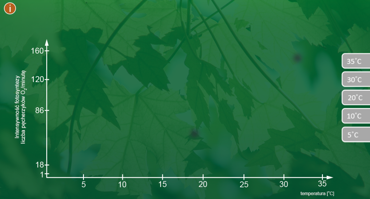 Symulacja interaktywna stanowi zestawienie intensywności fotosyntezy mierzonej w ilości wydzielonych pęcherzyków tlenu na minutę do temperatury. Temperatura na wykresie jest mierzona w stopniach Celsjusza. Zmierzono intensywność fotosyntezy w temperaturach: pięciu stopni Celsjusza, dziesięciu stopni Celsjusza, dwudziestu stopni Celsjusza, trzydziestu stopni Celsjusza oraz trzydziestu pięciu stopni Celsjusza. W temperaturze dziesięciu stopni Celsjusza osiągnięty został punkt wysycenia, przy wydzieleniu osiemnastu pęcherzyków tlenu cząsteczkowego na minutę. Punkt kompensacyjny świetlny został osiągnięty przez roślinę w temperaturze dwudziestu stopni Celsjusza. Wydzieliła ona osiemdziesiąt sześć pęcherzyków tlenu na minutę. To natężenie światła, przy którym równoważą się procesy pobierania i wydzielania dwutlenku węgla przez roślinę. Roślina nie wydziela ani nie pobiera dwutlenku węgla. Wysokie temperatury powodują stres termiczny u rośliny, która wolniej rośnie i daje mniejsze plony. Rośliny są zróżnicowane pod względem wymagań temperaturowych. Każdy gatunek posiada temperaturę optymalną. To taka temperatura, przy której fotosynteza zachodzi z największą intensywnością. Poniżej i powyżej tej granicy intensywność procesu spada. Na wykresie intensywność procesu fotosyntezy została zaznaczona białą krzywą. Temperatura wpływa na intensywność fotosyntezy, oddziałując na aktywność enzymów. Reakcje fotosyntetyczne przebiegają w dość szerokim zakresie temperatur od zera do czterdziestu pięciu stopni Celsjusza, przy czym przedział od dwudziestu do trzydziestu stopni Celsjusza to warunki optymalne dla procesu. Wzrost temperatury powyżej wartości optymalnych powoduje spadek intensywności fotosyntezy aż do jej całkowitego zahamowania. Temperatura wpływa na aktywność enzymów katalizujących przebieg przemian w fazie ciemnej fotosyntezy.