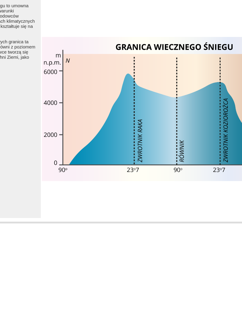 Granica wieloletniego śniegu to umowna linia, ponad którą istnieją warunki sprzyjające tworzeniu się lodowców górskich. W różnych strefach klimatycznych granica wiecznego śniegu kształtuje się na różnych wysokościach. W strefach okołobiegunowych granica ta przebiega praktycznie na równi z poziomem morza, wobec czego lodowce tworzą się bezpośrednio na powierzchni Ziemi, jako lądolody. Na pierwszej osi współrzędnych oś x oznacza szerokość geograficzną. Rozpoczyna się od 90 stopni, kolejno oznaczono na niej 23,7 stopnia – Zwrotnik Raka, 90 stopni – Równik, 23,7 stopnia – Zwrotnik Koziorożca i na końcu znów 90 stopni. Na osi y oznaczono metry nad poziomem morza – od 0 przez 2000, 4000, aż do 6000 m nad poziomem morza. Linia wykresu zaczyna się na osi x tuż za jej stykiem z osią y. Biegnie pionowo w górę aż do 6000 m nad poziomem morza na osi y, a na osi x punkt najwyższy ma tuż przed Zwrotnikiem Raka. Od tego miejsca zaczyna łagodnie spadać aż do 4000 m nad poziomem morza na osi y i do równika oznaczonego na osi x. Z tego miejsca zaczyna się znów lekko wznosić aż do wysokości około 5000 m nad poziomem morza na osi y, a na osi x do miejsca tuż za Zwrotnikiem Koziorożca. Od tego momentu gwałtownie spada w dół aż do osi x. Wysokość granicy wieloletniego śniegu zwiększa się, zbliżając się do zwrotnika. Najwyżej linia ta wznosi się w okolicach zwrotników, czyli najcieplejszych miejsc na Ziemi (ze względu na cyrkulację atmosferyczną, suchy klimat, brak opadów atmosferycznych). W okolicach równika wysokość granicy wiecznego śniegu nieco się obniża (ze względu na dużą ilość opadów atmosferycznych). Na drugiej osi współrzędnych zaznaczone są te same dane, ale nad linią obrazującą granicę wiecznego śniegu ujęte są nazwy geograficzne. I tak najbliżej styku osi x i y widnieje napis Spitsbergen, dalej Islandia i Alpy. W punkcie kulminacyjnym tuż za Zwrotnikiem Raka znajduje się nazwa Himalaje, a na wysokości równika na osi x Kilimandżaro. Za miejscem oznaczającym Zwrotnik Koziorożca, gdy linia zaczyna opadać jest napis Nowa Zelandia, poniżej Kerguelen, a na samym końcu osi x napis Antarktyda.
