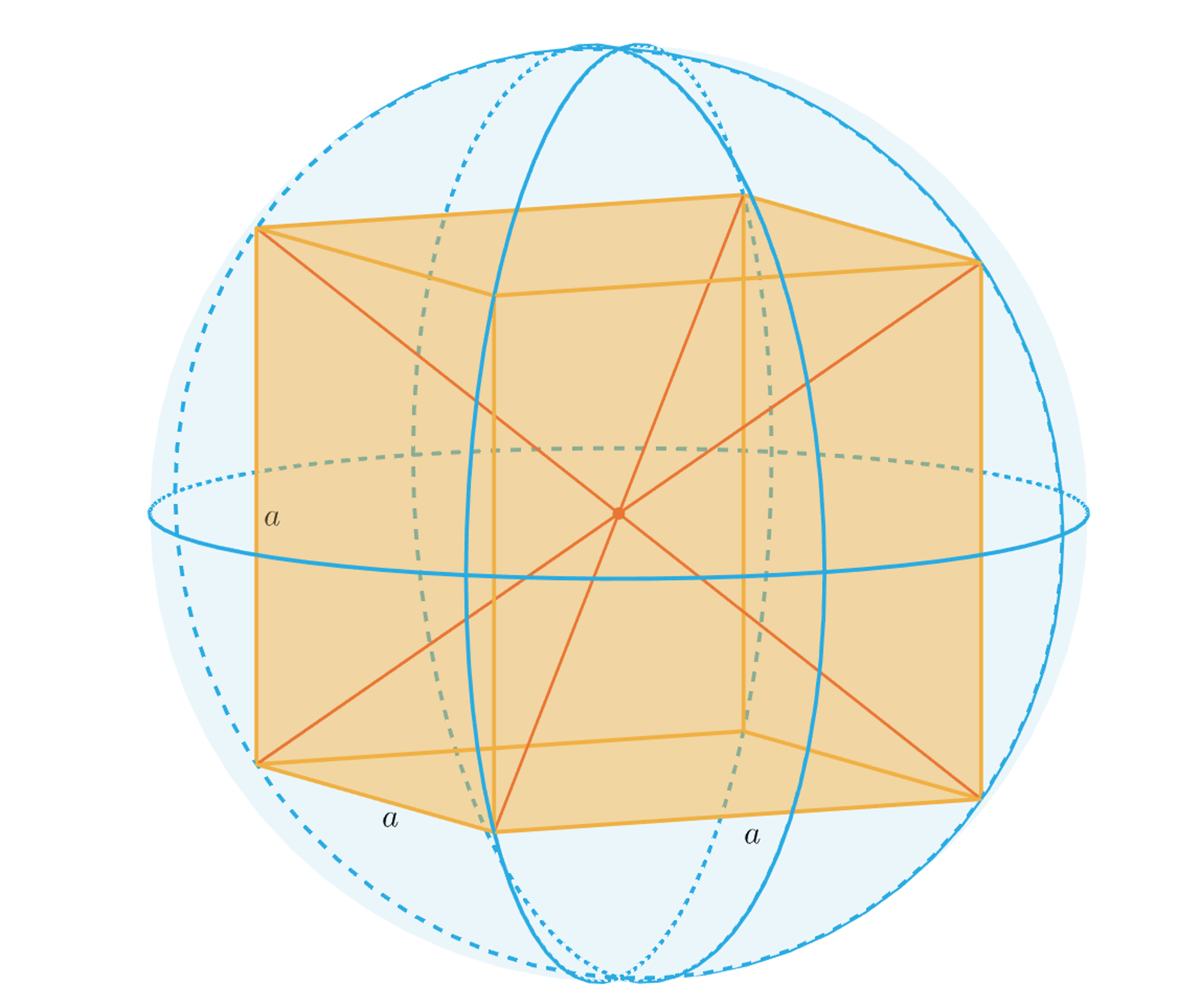 Zapoznaj się z poniższą symulacją interaktywną. Przedstawiono w niej sześcian wpisany w kulę. Narysuj w zeszycie przekrój płaszczyzną przechodzącą przez środek kuli i przekątną podstawy sześcianu.