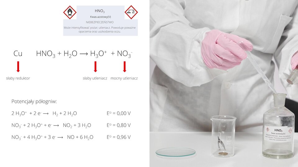 Uczniowie, wykonując doświadczenia, mieli do dyspozycji magnez, cynk i miedź, a także stężony kwas azotowy(V) oraz kwas solny.