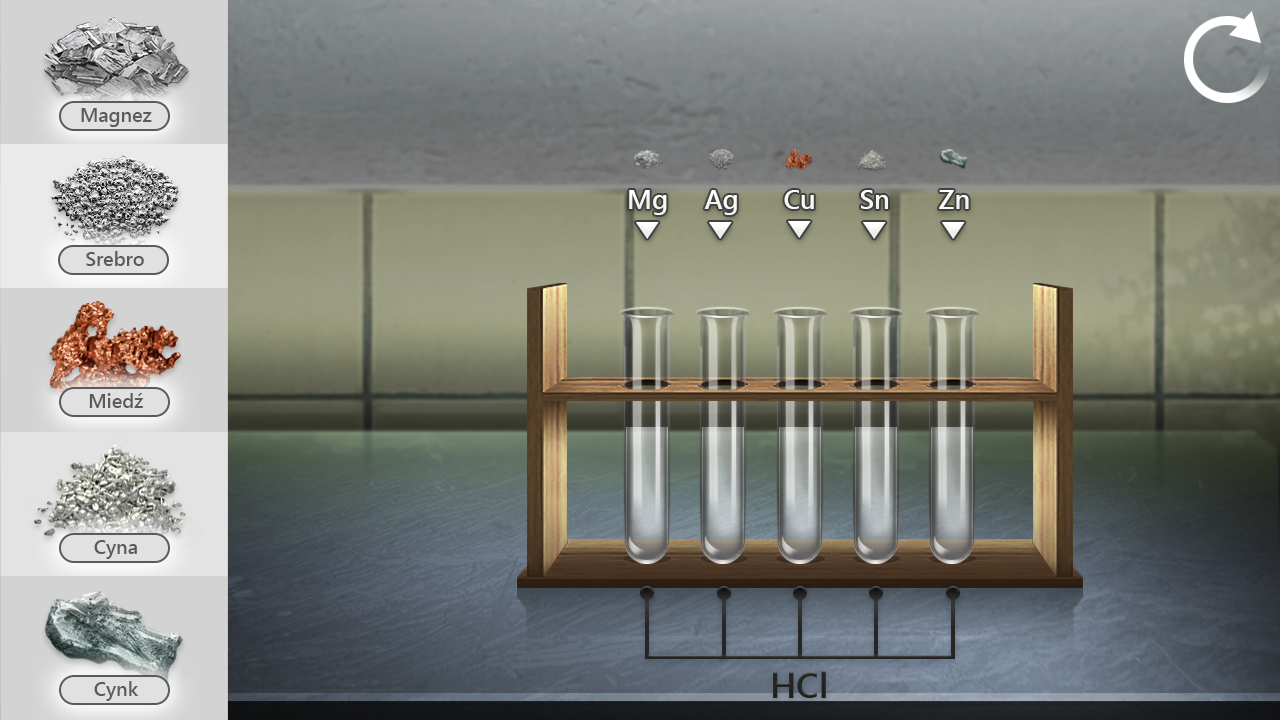 Przeanalizuj poniższą symulację. Sprawdź, jak zachowują się wybrane metale w reakcji z kwasem chlorowodorowym, a następnie rozwiąż ćwiczenia sprawdzające.