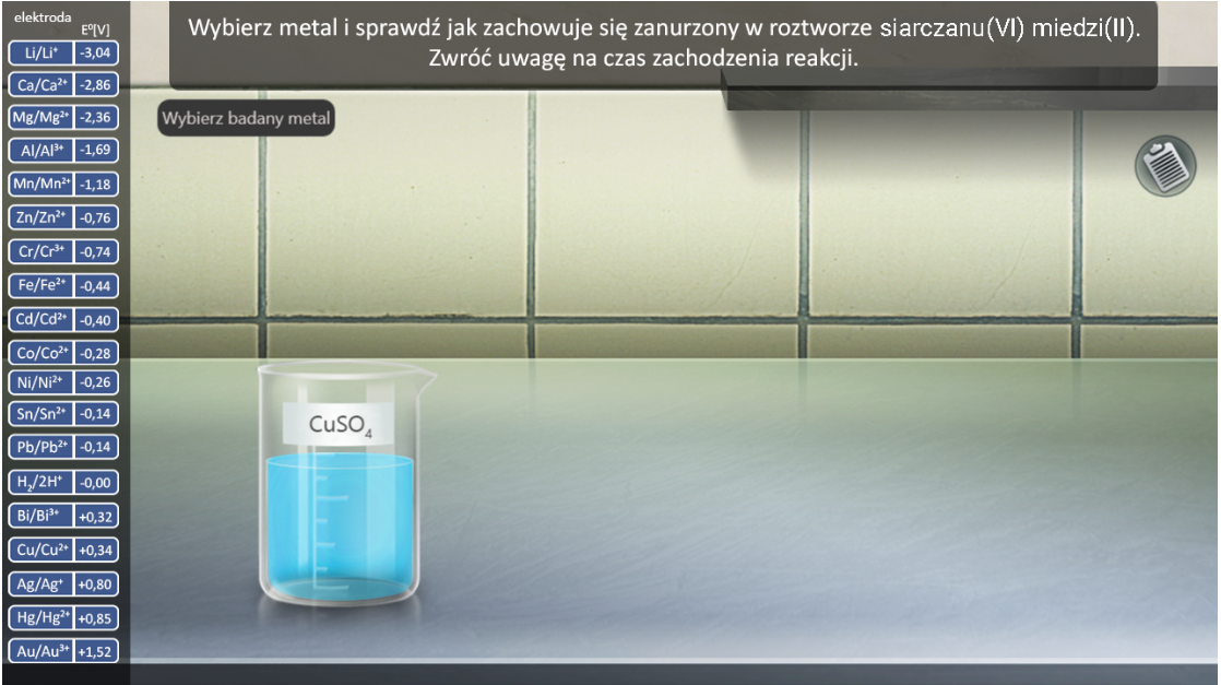 Za pomocą przedstawionej poniżej symulacji, zbadaj reakcję wybranego metalu z roztworem siarczanu miedzi. Następnie rozwiąż zadania.