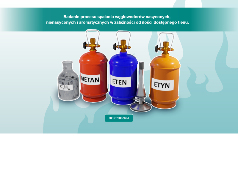 Zapoznaj się z opisem symulacji dotyczącej badania procesu spalania węglowodorów nasyconych, nienasyconych i aromatycznych, w zależności od ilości dostępnego tlenu. Następnie odpowiedz na poniższe pytania.