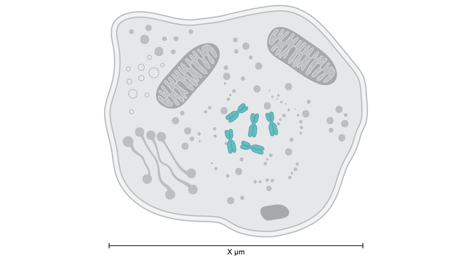 Symulacja interaktywna przedstawia komórkę zwierzęcą z poszczególnymi organellami w kolorze szarym. Po kliknięciu w niebieskie chromosomy, znajdujące się pośrodku komórki na tle jądra komórkowego pojawiają się informacje dotyczące upakowania DNA w jądrze komórkowym. Schemat komórki znika, a wyświetla się duży rysunek chromosomu. Na jednym z ramiom narysowany jest czarny okrąg, obok niego opis: chromosom metafazowy jest najbardziej skondensowaną formą chromatyny. Jest on widoczny podczas podziału komórki. Jego szerokość wynosi 1400 nanometrów.