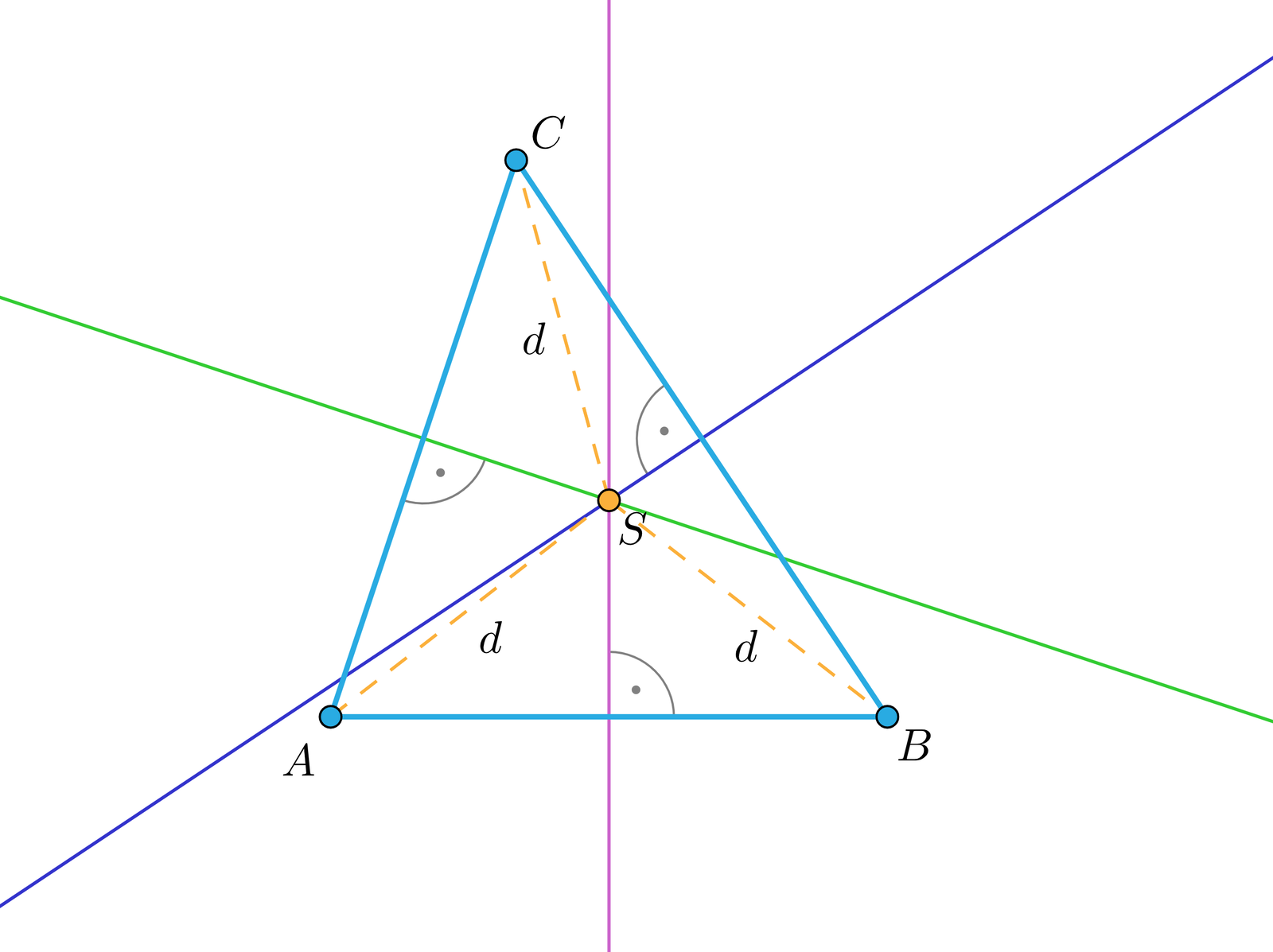Otwórz symulację interaktywną i obserwuj położenie punktu przecięcia symetralnych boków trójkąta w zależności od jego rodzaju.