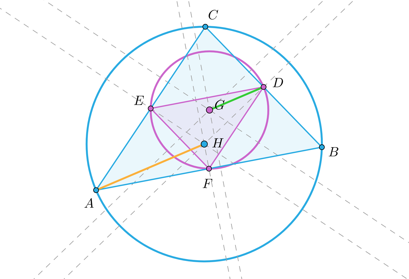 Zapoznaj się z poniższym opisem apletu, w którym przedstawiono trójkąt, którego boki są liniami środkowymi. Jest to trójkąt środkowy D E F. Zwróć szczególną uwagę na zależność długości promienia okręgu opisanego na trójkącie środkowy D E F od długości promienia okręgu opisanego na trójkącie A B C.