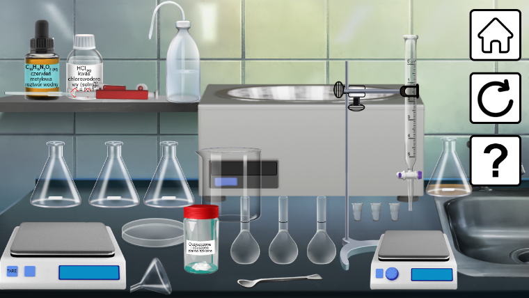 Symulacja dotyczy badania właściwości fizykochemicznych szkła. Doświadczenie 1. Badamy wodoodporność. W środowisku badania mamy do wyboru temperaturę, wilgotność w procentach, czas narażenia na podane czynniki: od dwóch do sześciu miesięcy. Wstawiamy różne wartości. Kawałek szkła umieszczamy w zakręconym naczyniu. Szkło nie ulega zmianie. Wyniki eksperymentu: szkło float ma klasę hydrolityczną od trzech do pięciu. Doświadczenie 2. Badamy kwasoodporność. W środowisku badania do wyboru mamy następujące rodzaje kwasu: ha Ce eL, Ha be er, ha en o trzy, Ha dwa eS O cztery, Ha trzy Pe O cztery. Czas narażenia na podane czynniki: od dwóch do sześciu miesięcy po wstawieniu odpowiednich danych parametrów i wyborze rodzaju kwasu wynik eksperymentu jest następujący: szkło float ma kwasoodporność jeden. Doświadczenie 3. Gęstość przy 18 stopniach Celsjusza. Wskazówki: zważ pusty plik piknometr. W pierwszym kroku wytaruj wagę i postaw piknometr na wadze. Masa piknometru równa się 25 przecinek 8640 gramów. Kolejna wskazówka. Ściągnij piknometr z wagi. Napełnij piknometr wodą i zważ. Piknometr z wodą waży 50 przecinek 0236 gramów. Kolejny krok: opróżnij piknometr. Dodajemy 5 gram substancji stałe. Masa piknometru z badanym ciałem wynosi 30 przecinek 8640 g. Wskazówki: dopełnij piknometr z badanym ciałem wodą i zważ. Masa piknometru z badanym ciałem i wodą wynosi 53 przecinek 0236 g. Wykonaj obliczenia. Pamiętaj, że gęstość wody to: de równa się 1 gram na centymetr sześcienny. Wynik: gęstość badanej próbki szkła float wynosi 2 przecinek 5 g na centymetr sześcienny. W kolejnych próbach dodajemy 10 gram i 20 gram substancji. Przy 10 gramach substancji piknometr z badanym ciałem waży 35 przecinek 8640 gramów, a z wodą 56 przecinek 0236 g. Po dodaniu 20 g substancji piknometr waży 45 przecinek 8640 g, a z wodą 62 przecinek 0236 g. Wynik doświadczenia zawsze taki sam: gęstość badanej próbki szkła float wynosi 2 przecinek 5 g na centymetr sześcienny. Doświadczenie 4. Twardość. Na powierzchnię szkła działamy różnymi minerałami. Jego powierzchnię rysuje korund, diament, apatyt, ortoklaz oraz kwarc. Powierzchni nie rysują talk, gips, kalcyt, fluoryt, topaz.