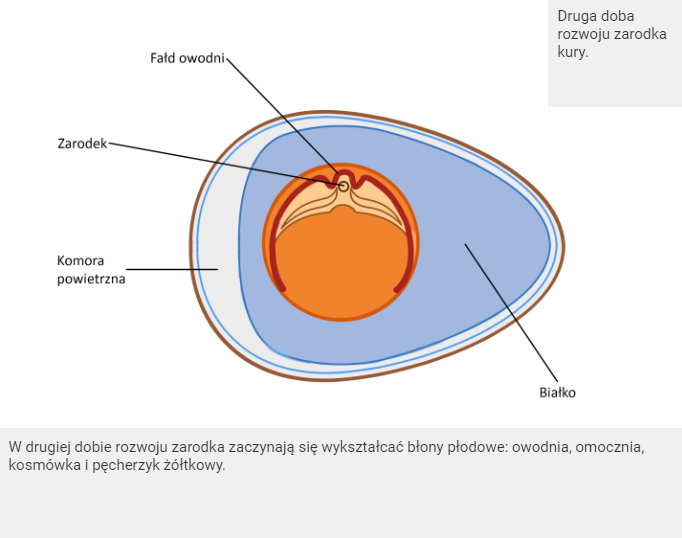 Symulacja przedstawia kolejne etapy rozwoju błon płodowych. Slajd 1. Druga doba rozwoju zarodka kury. Na ilustracji jest kształt jaja. W środku znajduje się białko. Pomiędzy białkiem a skorupką jaja w dolnej, szerszej części jest komora powietrzna. W białku znajduje się okrągłe żółtko. W jednym miejscu żółtka jest niewielki zarodek. W jego pobliżu jest fałd owodni. Opis. W drugiej dobie rozwoju zarodka zaczynają się wykształcać błony płodowe: owodnia, omocznia, kosmówka i pęcherzyk żółtkowy.Druga doba rozwoju zarodka kury Trzecia doba rozwoju zarodka kury Piąta dobra rozwoju zarodka kury Czternasta doba rozwoju zarodka kury W drugiej dobie rozwoju zarodka zaczynają się wykształcać błony płodowe: owodnia, omocznia, kosmówka i pęcherzyk żółtkowy. Slajd 2. Trzecia doba rozwoju zarodka kury. Na ilustracji nadal w jaki jest zarodek w postaci kropki. Pojawia się kosmówka, następnie ku wnętrzu żółtka owodnia wraz z fałdem leżącym w pobliżu zarodka, omocznia. Omocznia wpukla się w pozazarodkową jamę ciała. Po prawej stronie żółtka za owodnią jest pęcherzyk żółtkowy. Opis. Owodnia powstaje z fałdów ektodermy, tworzących się nad przednią częścią przedłużenia głowowego. Przestrzeń między owodnią a zarodkiem wypełnia płyn owodniowy, chroniący zarodek przed wstrząsami oraz wysychaniem. Znajdują się w nim substancje odżywcze (fruktoza i tłuszcz) oraz enzymy, które ułatwiają rozpuszczanie złuszczonego nabłonka zarodka. Kosmówka powstaje z zewnętrznej części fałdu głowowego. Błona ta okrywa zarodek i pęcherzyk żółtkowy. Od zewnątrz zbudowana jest z ektodermy, bezpośrednio stykającej się z białkiem. Z białka pobierane są substancje odżywcze. Omocznia powstaje poprzez uwypuklenie tylnej części jelita do pozazarodkowej jamy ciała. Do szóstej doby rozwoju zarodka pełni funkcję narządu oddechowego: pobiera tlen z powietrza, przechodzącego przez pory w skorupie, a wydala dwutlenek węgla. Pęcherzyk żółtkowy otacza żółtko. Znajdują się w nim liczne naczynia krwionośne. Zarodek korzysta ze składników odżywczych zawartych w żółtku. Substancje te są rozkładane za pomocą enzymów na substancje przyswajalne. Przechodzą one do naczyń krwionośnych, a następnie do zarodka. Slajd 3. Piąta doba rozwoju zarodka. Na ilustracji rozrasta się fałd owodni oraz jama owodni, rozrasta się omocznia. Opis. Omocznia, rozrastając się, wsuwa się pomiędzy kosmówkę i pęcherzyk żółtkowy. Slajd 4. Czternasta doba rozwoju zarodka kury. Na ilustracji zarodek jest nieco większy. Owodnia otacza go, ale nie jest domknięta. Przypomina kształtem rogala. Między ścianami owodni jest jama owodni. Następnie jest kosmówka omoczniowa i omocznia. Żółtko zajmuje niemal całe białko. W górnej części żółtka, od węższej strony jajka, jest wgłębienie. Wgłębienie zajmuje białko. Opis. Do owodni przenika białko. Przed wykluciem się piskląt płyn owodni wysycha, a błona przylega bezpośrednio do zarodka. Omocznia zrasta się z kosmówką, tworząc błonę zwaną kosmówką omoczniową. Niewykorzystane w czasie rozwoju zarodka żółtko i pęcherzyk żółtkowy zostają wciągnięte do jelita zarodka przed wykluciem. Naczynia krwionośne zawarte w pęcherzyku łączą się z układem krwionośnym zarodka przez żyły skrzydłowe.