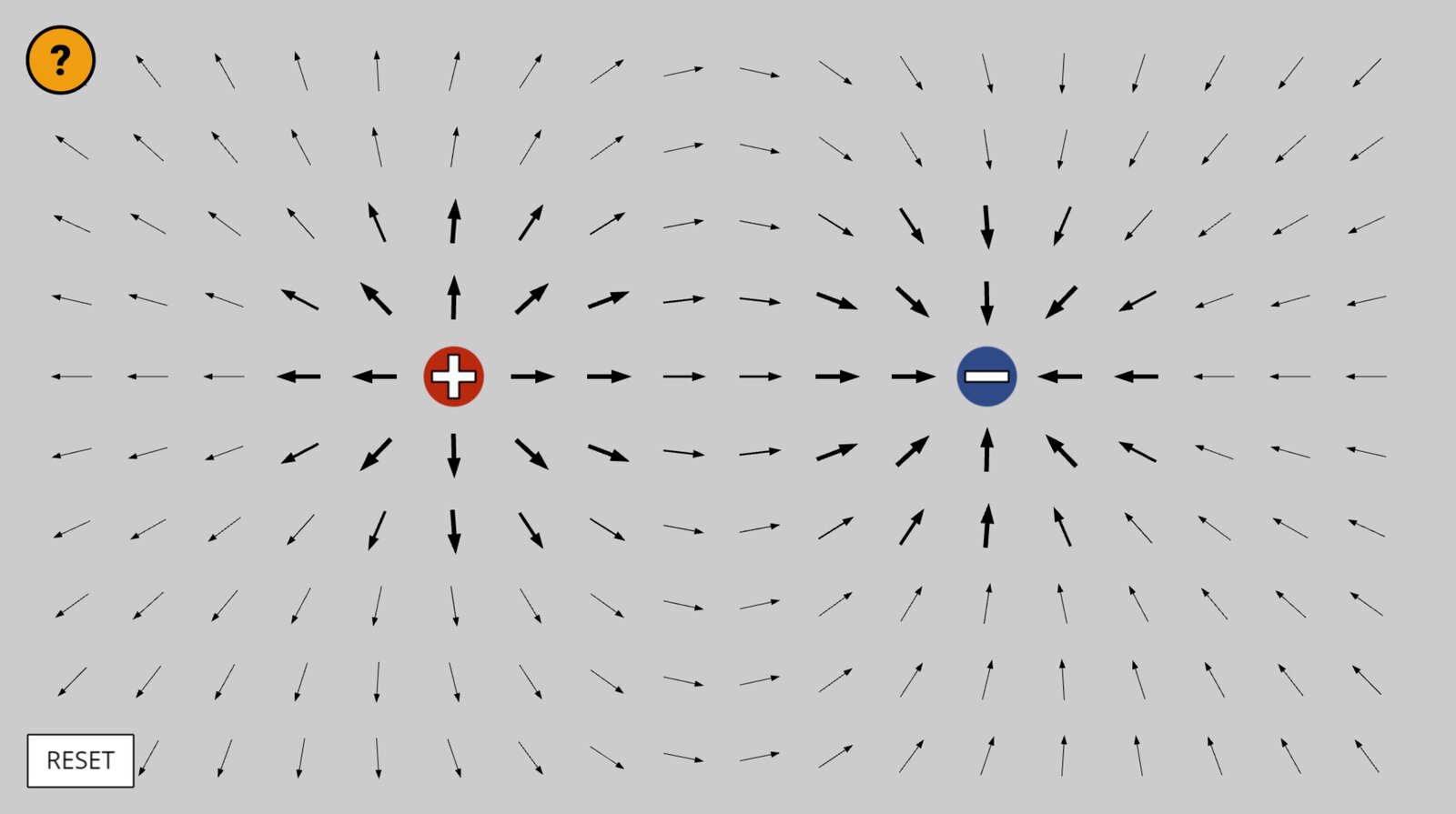 Symulacja przedstawia dwa ładunki leżące na linii poziomej. Z lewej strony znajduje się ładunek dodatni, a z prawej ujemny. Cały obszar rysunku pokrywają czarne, krótkie strzałki wskazujące zwrot linii pola elektrycznego. W małej odległości od ładunku strzałki są grube. Im dalej od ładunków, tym strzałki są coraz cieńsze. W pobliżu ładunku ujemnego strzałki skierowane są promieniście w stronę ładunku. W pobliżu ładunku dodatniego strzałki skierowane są promieniście od ładunku. W obszarach nad i pod linią łączącą oba ładunki strzałki układają się wzdłuż łuków o początku na ładunku dodatnim i końcu na ładunku ujemnym. Za pomocą myszki można przesuwać ładunki na ekranie we wszystkie strony. Można też dodawać kolejne ładunki i zmieniać ich znak, ale wartość bezwzględna każdego ładunku jest zawsze jednakowa. Gdy przesuwamy ładunek wzdłuż linii poziomej, strzałki nad nim i pod nim zmieniają kierunek ustawiając się zawsze wzdłuż promieni wychodzących z ładunku. Gdy ustawimy sześć ładunków dodatnich w wierzchołkach sześciokąta foremnego, to na zewnątrz sześciokąta strzałki układają się wzdłuż linii przecinających się w środku sześciokąta i są zwrócone na zewnątrz. W pobliżu środka sześciokąta bardzo cienkie strzałki skierowane są do punktu środkowego. W punkcie środkowym brak strzałki. Jeśli zmienimy znaki ładunków w wierzchołkach sześciokąta na ujemne, to w pobliżu środka sześciokąta bardzo cienkie strzałki skierowane są od punktu środkowego, a w punkcie środkowym brak strzałki. Na zewnątrz sześciokąta strzałki układają się wzdłuż linii przecinających się w środku sześciokąta i są zwrócone do wewnątrz.