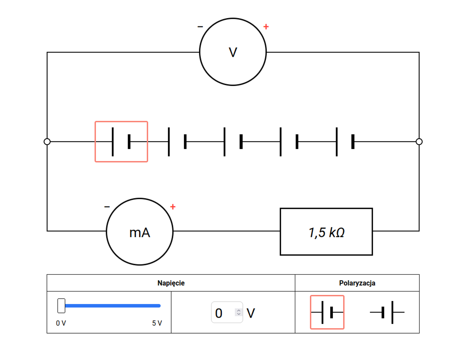 Okno symulacji składa się z trzech elementów. W prawym górnym rogu znajduje się przycisk START, który po włączeniu symulacji zmienia się na STOP. Pod przyciskiem START/STOP znajduje się opcja „Poziom rozszerzony”, którą można zaznaczyć lub odznaczyć. W środku ekranu znajduje się obwód elektryczny, który składa się z trzech gałęzi. Na górnej gałęzi znajduje się woltomierz przedstawiony za pomocą okręgu z wielką literą V w środku. Po lewej stronie woltomierza znajduje się znak minus, po prawej znak plus. Na środkowej gałęzi znajduje się pięć źródeł napięcia połączonych jedno z drugim. Symbol źródła składa się z dwóch pionowych kresek. Grubsza i krótsza symbolizuje biegun ujemny, a cieńsza i dłuższa – biegun dodatni. Na dolnej gałęzi znajduje się amperomierz przedstawiony za pomocą okręgu z oznaczeniem m wielka litera A w środku. Po lewej stronie amperomierza znajduje się znak minus, po prawej znak plus. Na tej samej gałęzi, szeregowo do amperomierza znajduje się opornik, symbolizowany przez prostokąt. Wewnątrz prostokąta znajduje się oznaczenie 1,5 kilooma. Pod obwodem znajduje się okno, w którym można zmieniać parametry źródeł napięcia w obwodzie. Aby zmienić parametry danego źródła, należy je kliknąć. Otacza się ono wtedy czerwoną ramką. Za pomocą suwaka, strzałek lub przez wpisanie liczby w okienku można ustawić wartość napięcia na danym źródle. Można również zmienić polaryzację źródła w obwodzie, tj. zamienić miejscami biegun dodatni i ujemny. Domyślnie wszystkie źródła ustawione są w ten sposób, że biegun ujemny źródła jest po prawej, a dodatni po lewej.