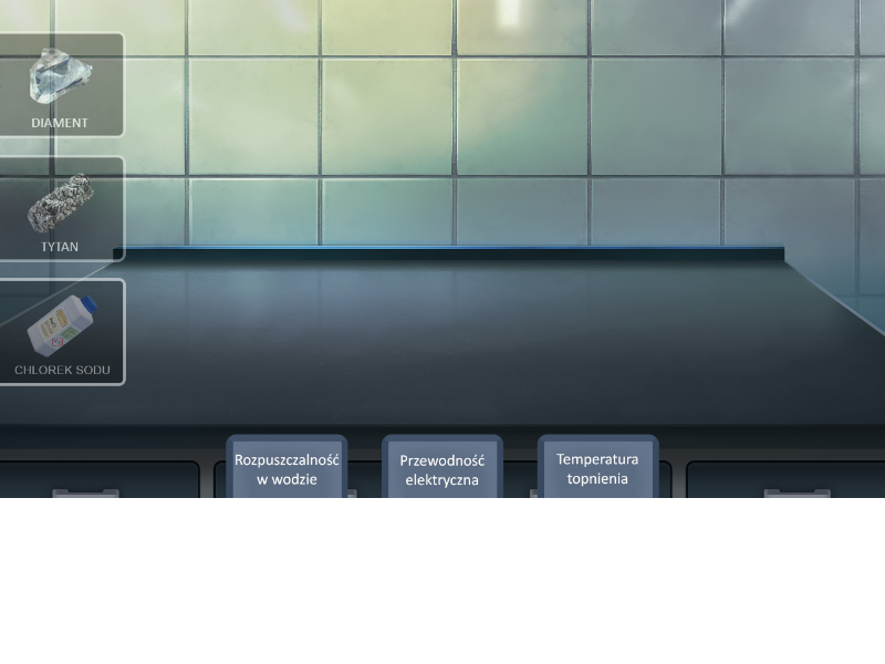 W symulacji zaprezentowano doświadczenie sprawdzające rozpuszczalność wybranych substancji poprzez umieszczenie ich próbek w zlewce z wodą. Pierwsza z nich, diament, nie uległa rozpuszczeniu, druga będąca próbką tytanu również nie rozpuściła się, ostatnia czyli chlorek sodu rozpuścił się. Następnie zbadano przewodność elektryczną wyżej wymienionych substancji poprzez włączenie ich do obwodu elektrycznego zawierającego żarówkę. W przypadku diamentu żarówka nie zapaliła się. Włączenie do obwodu tytanu spowodowało zapalenie żarówki, podobną obserwację poczyniono dla roztworu chlorku sodu. Ostatnia z badanych właściwości, temperatura topnienia została określona za pośrednictwem umieszczenia wybranych substancji w specjalnym naczyniu oraz doprowadzenia do ich stopienia przy jednoczesnej kontroli temperatury. Dla diamentu uzyskano wynik 3500 stopni Celsjusza, dla tytanu 1668 stopni Celsjusza, zaś dla chlorku sodu 801 stopni Celsjusza.
