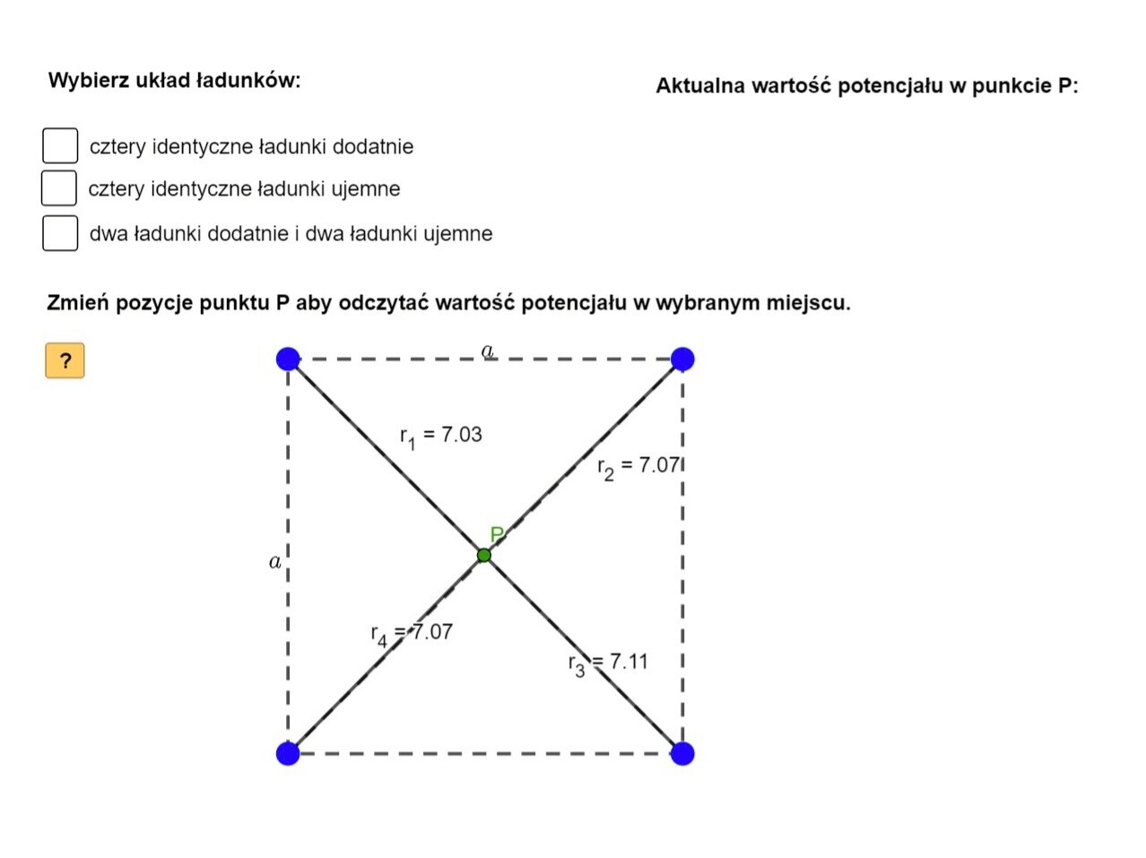 Na ekranie widać cztery ładunki o identycznych wartościach bezwzględnych umieszczone w rogach kwadratu. Boki kwadratu narysowano czarną linią przerywaną a ich długość oznaczono małą literą a. Na ekranie znajduje się też zielony punkt P, który możemy przesuwać dowolnie po ekranie. Odległości od kolejnych ładunków zmieniają się i są podawane na bieżąco. Na bieżąco podawana jest także wartość potencjału w punkcie P. Za pomocą trzech boksów można wybrać czy ładunki wytwarzające to pole elektryczne mają być wszystkie dodatnie, wszystkie ujemne czy też dwa dodatnie dwa ujemne. W przypadku czterech ładunków dodatnich lub ujemnych natężenie pola w środku kwadratu jest równe zeru ale potencjał ma wartość cztery razy większą niż ta pochodząca od jednego ładunku i nie będzie równy zeru. W przypadku dwóch ładunków ujemnych i dwóch dodatnich potencjał elektryczny w środku kwadratu będzie równy zeru.