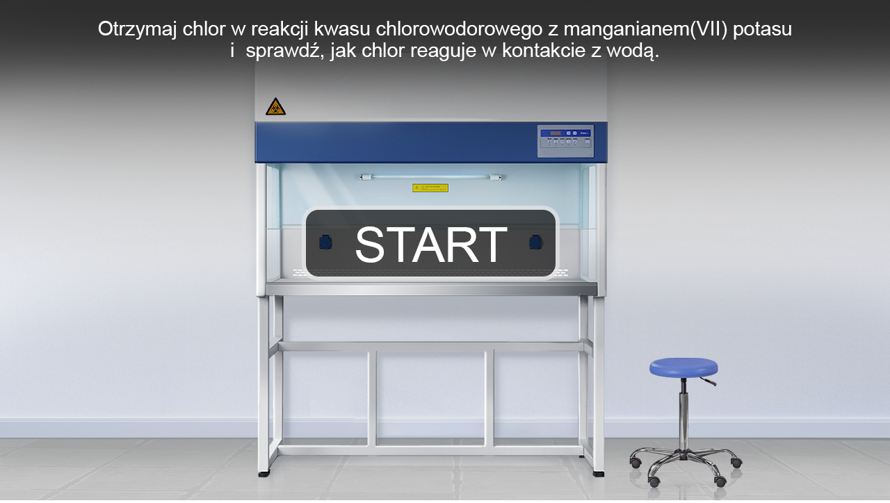 W symulacji otrzymano chlor w reakcji kwasu chlorowodorowego z manganianem(siedem potasu i sprawdzono, jak otrzymany gaz zachowuje się w kontakcie z wodą. Doświadczenie przeprowadzono pod dygestorium, ponieważ doświadczenia z substancjami szkodliwymi dla zdrowia wykonuje się pod sprawnym dygestorium. Dygestorium posiada panel sterowania, za pomocą którego można wyregulować, na przykład siłę nawiewu czy wysokość przesłony. Od lewej znajdują się kolejno: włącznik dygestorium, światła, włącznik nawiewu, przyciski umożliwiające zmniejszanie i zwiększanie nawiewu oraz alarm. Ponadto zdefiniowano oznaczenia oraz piktogramy występujące na dygestorium i odczynnikach chemicznych użytych w tym doświadczeniu. Oznaczenie pierwsze. Skażenie biologiczne, chemiczne